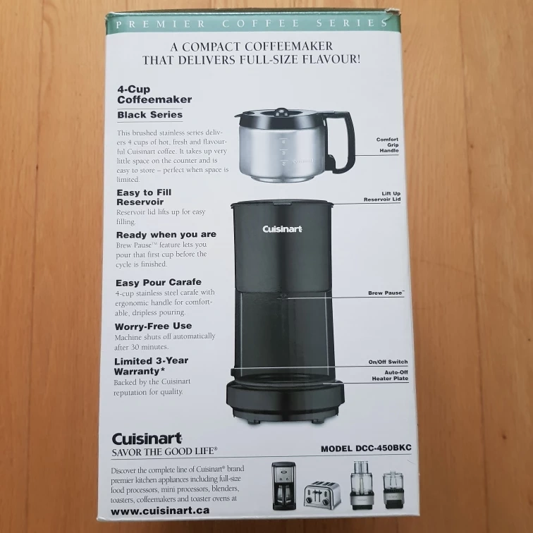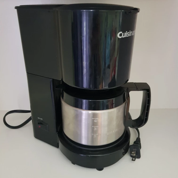 Black coffeemaker with stainless steel carafe. Brews up to 4 cups of coffee. Compact unit. Comes with an instruction manual. Missing the scoop in the set. Original price: $39.99 Cash only Pickup near or at Cornell Public Library, or Delivery to Markham, Pickering, or Stouffville
