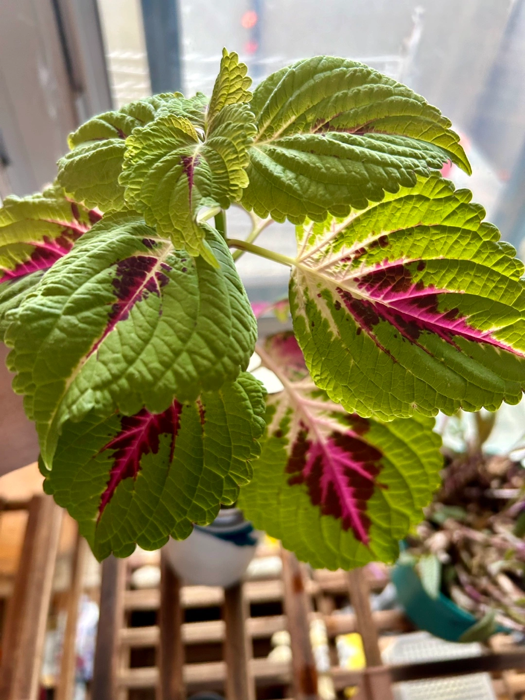 Coleus plant . Healthy plant with green and pink leaves. Will grow big quick.