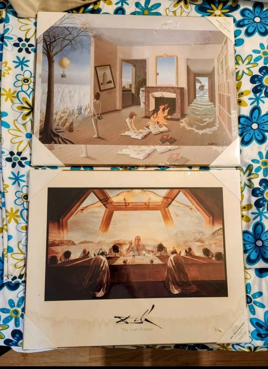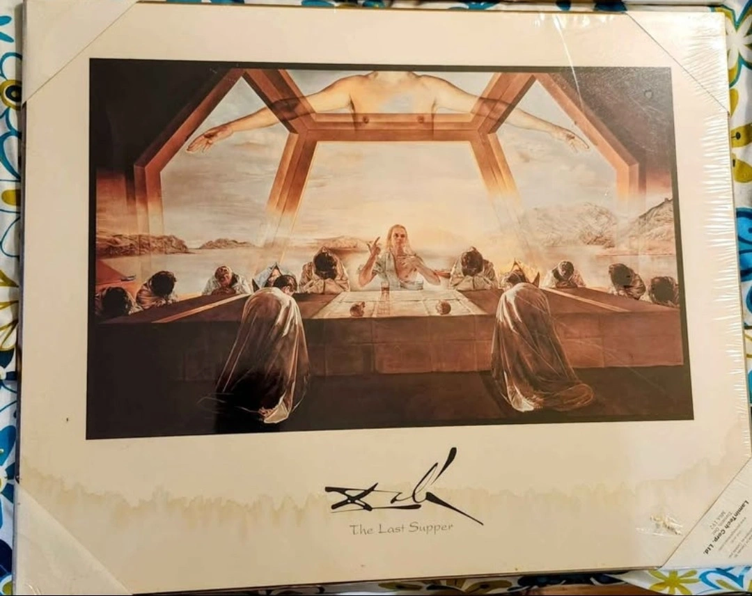 Two framed prints featuring art by Salvador Dali. The Last Supper and The Sacrament. Both in good condition.