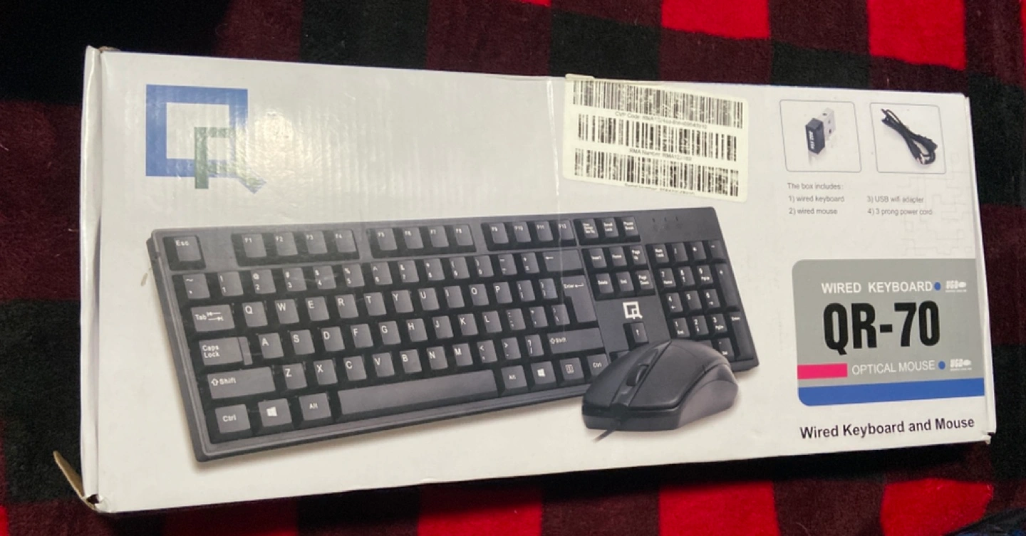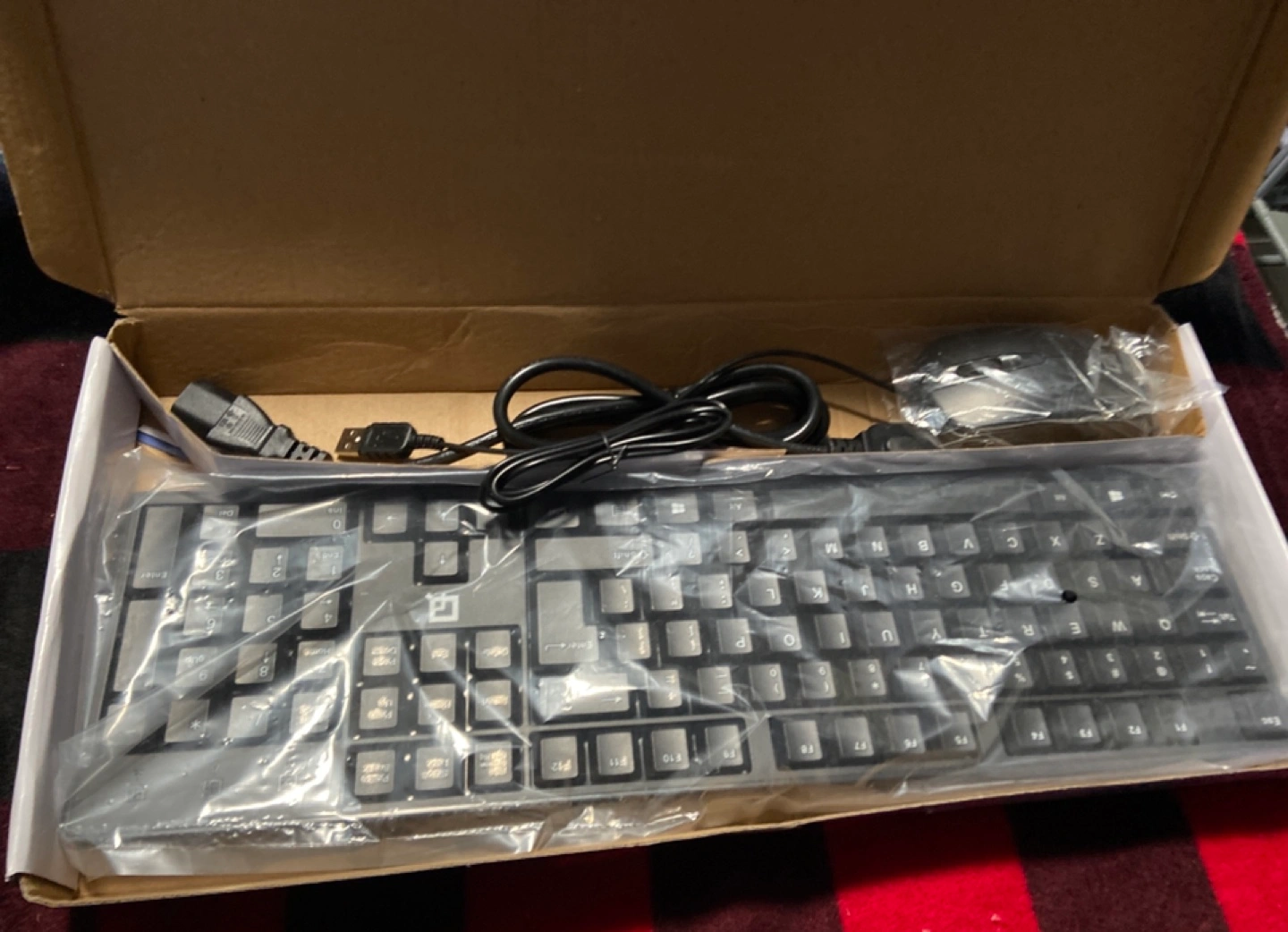 Wired keyboard and mouse set. Includes USB receiver, power adapter, and cords. Never used, still in packaging.