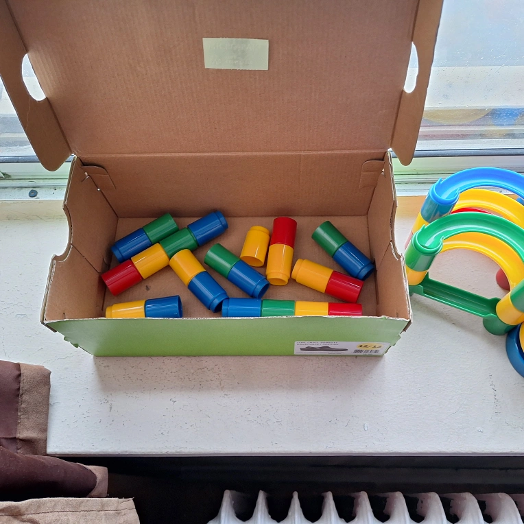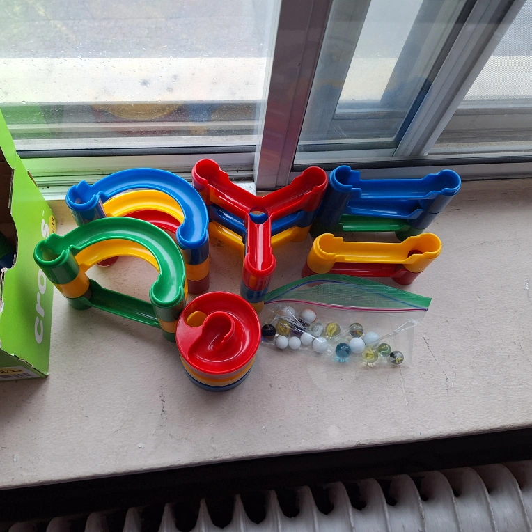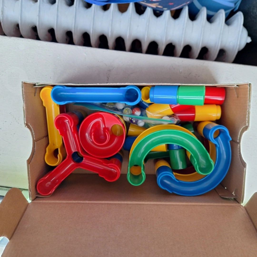Marble run toy, includes various pieces and marbles. The toy is in good condition. Works great and very sturdy. nice as a first marble run set but not for young children as marbles are a choking hazard.