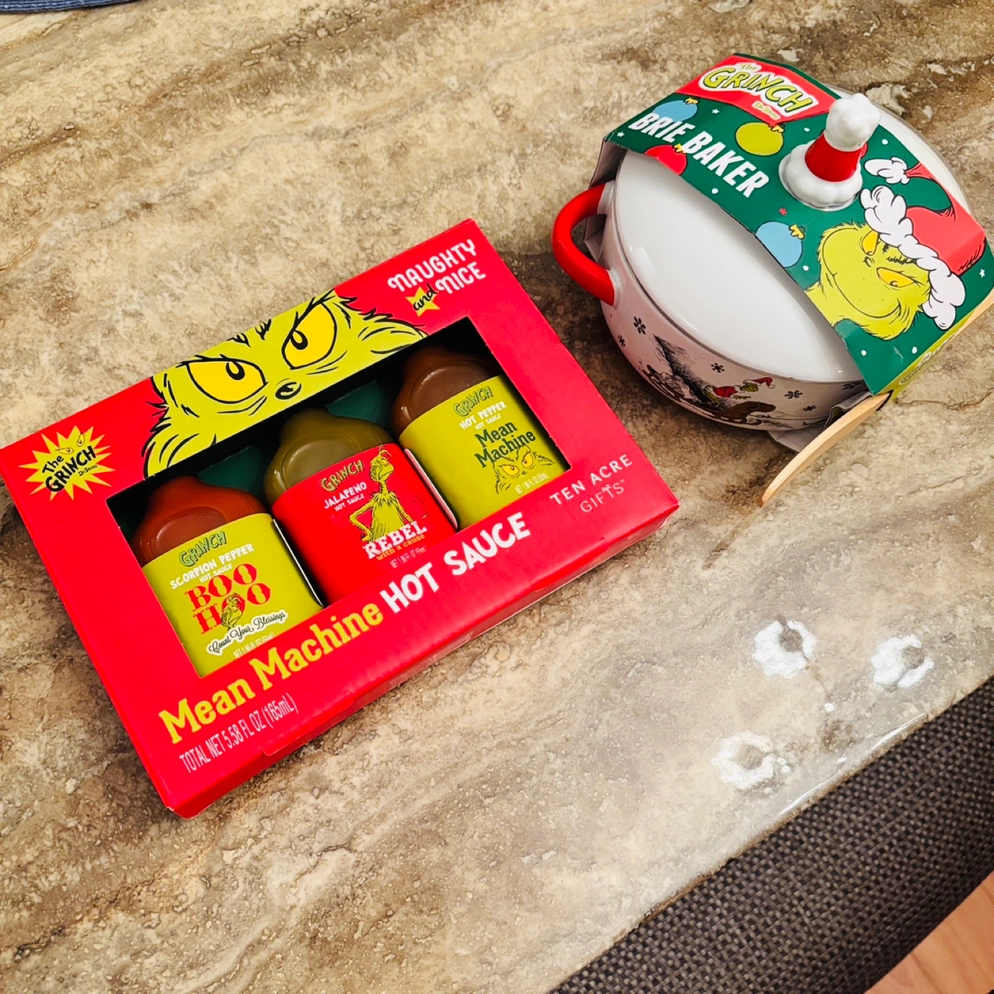 Set includes three Grinch-themed hot sauces and a metal Grinch brie baker with a wooden spoon. Great gifts. Were over $100 originally.