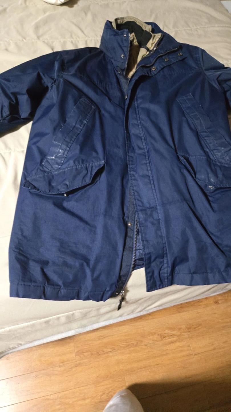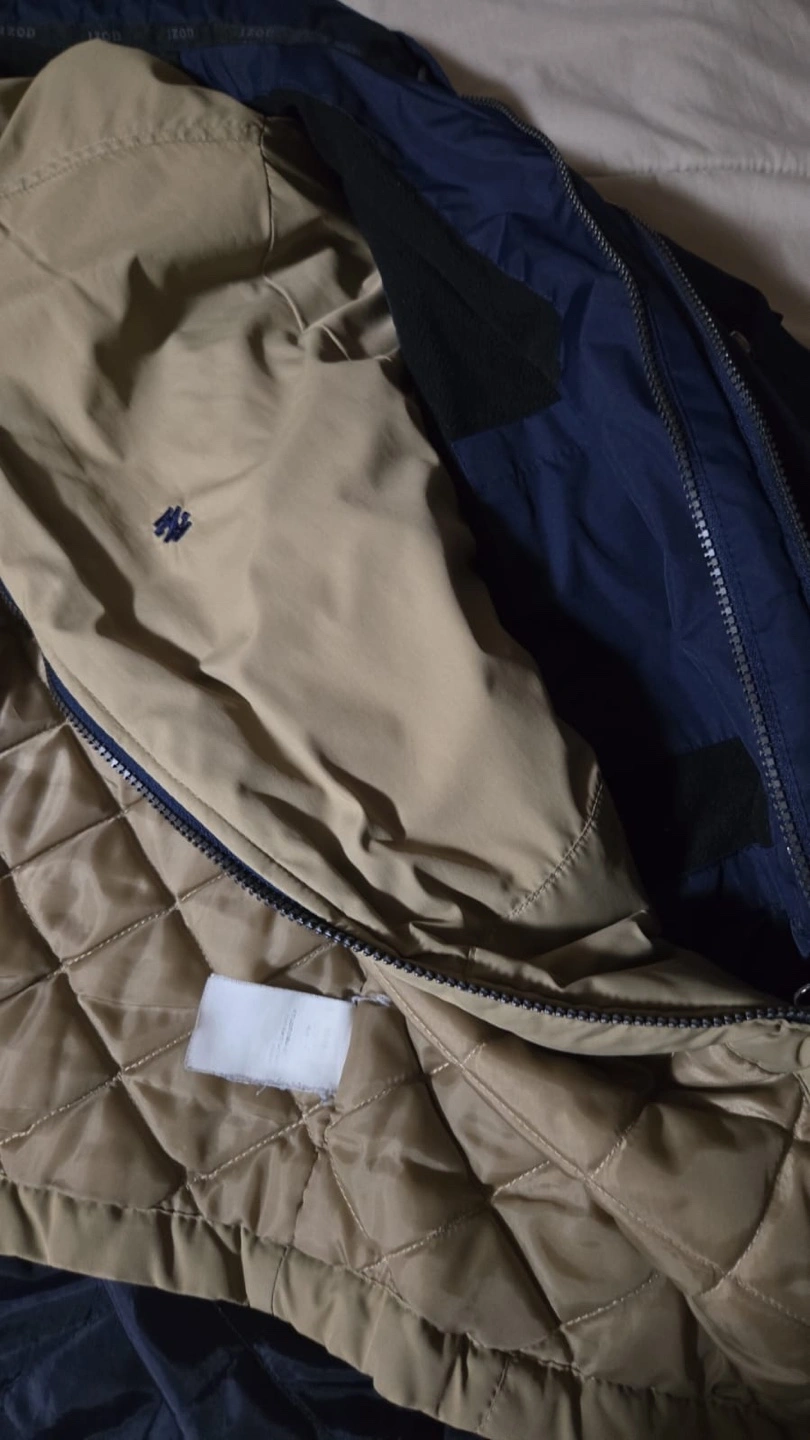 Men's winter jacket, navy blue with a tan quilted lining. Has pockets and a zipper closure. Location Bristol and Kennedy Kindly, check out the other items Thank you for your interest