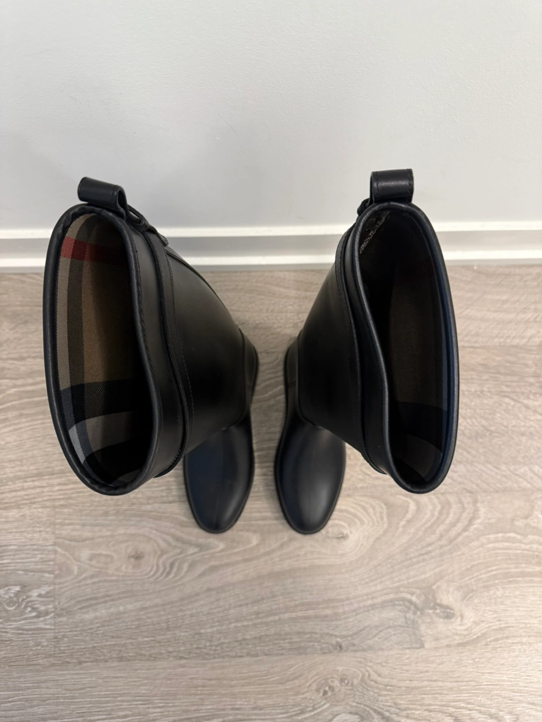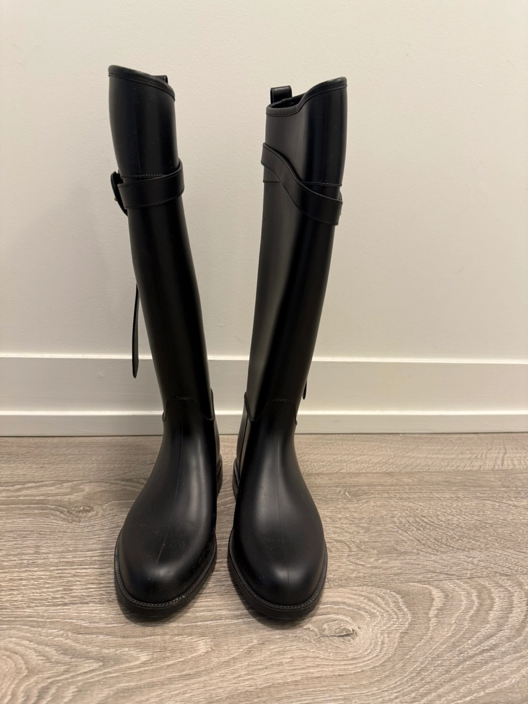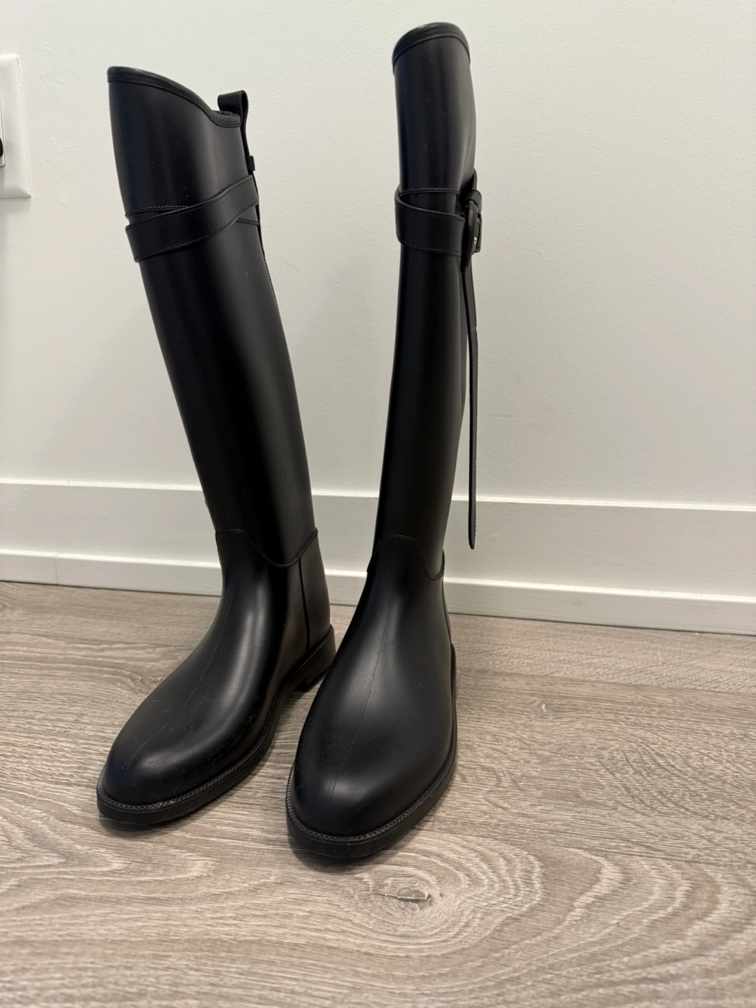 Black rubber knee-high boots with a buckle detail and Burberry check lining. Made in Italy. I bought this boots in outlet mall more than 5 years ago. No receipts and no box unfortunately. I am selling because it fits me small and I wore it less than 5 times. Minor scratches, but overall in a great condition. Original price was $600-$700 as I recall. Huge marked down!