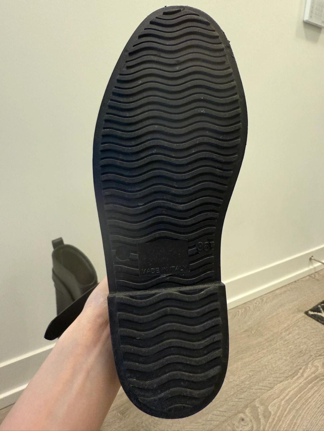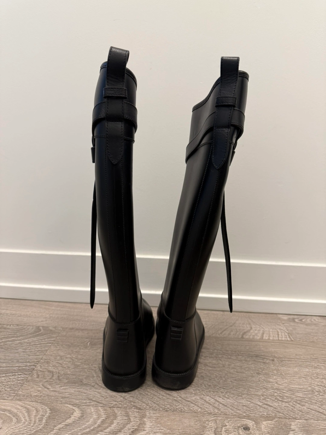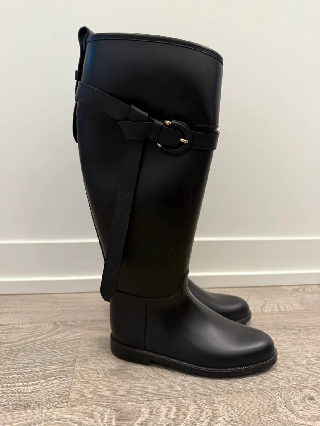 Black rubber knee-high boots with a buckle detail and Burberry check lining. Made in Italy. I bought this boots in outlet mall more than 5 years ago. No receipts and no box unfortunately. I am selling because it fits me small and I wore it less than 5 times. Minor scratches, but overall in a great condition. Original price was $600-$700 as I recall. Huge marked down!