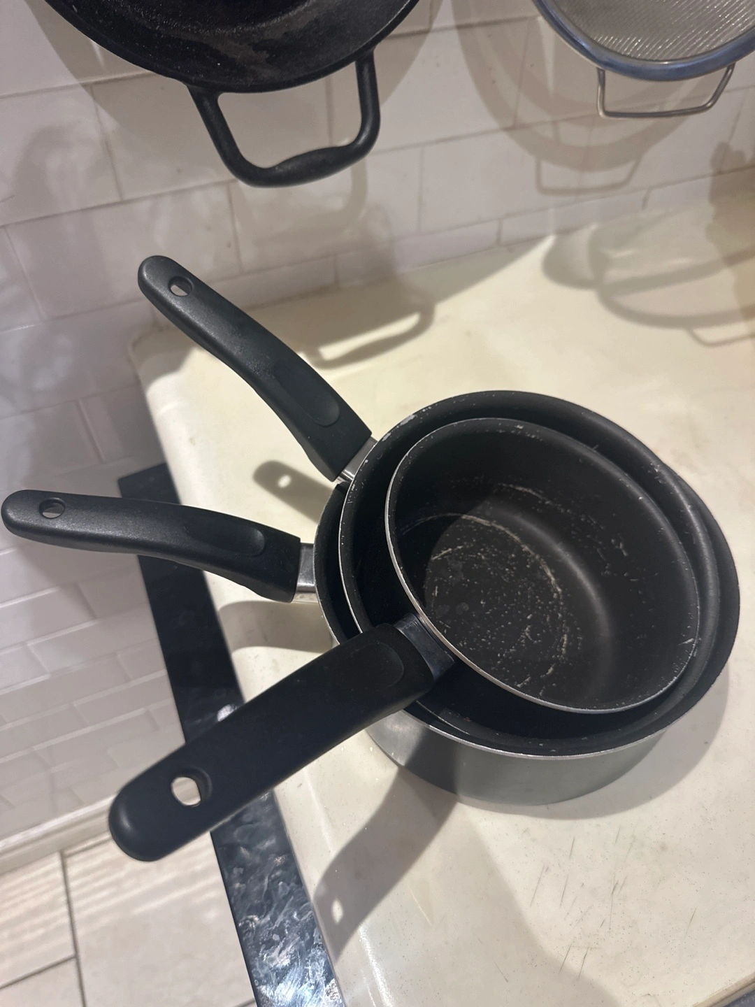 Three small pots with black handles. The pots are nested and the handles are on the side. The smallest pot is on top. The pots are in good condition with minor wear and tear.