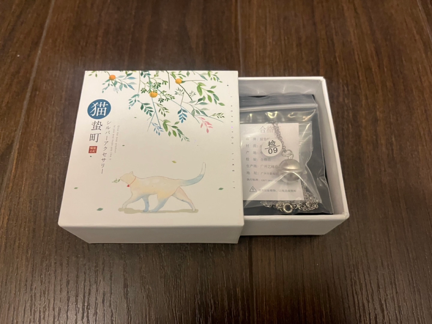 Silver cat bell necklace with a small charm on a chain. Comes in a box with a cat design.