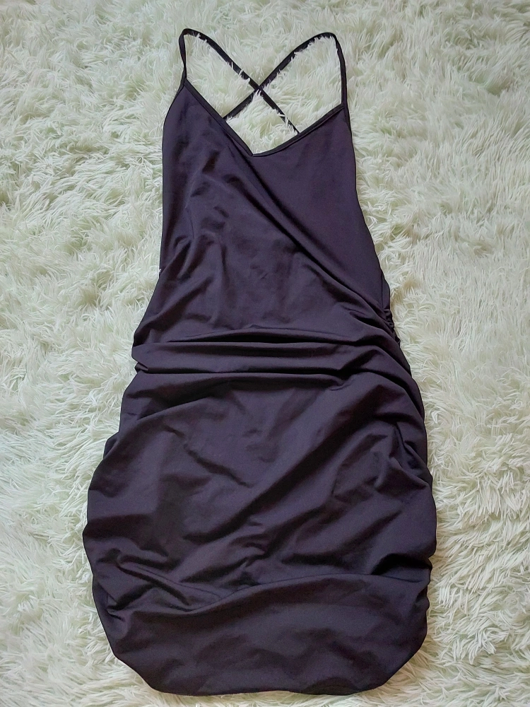 Black mini dress with spaghetti straps that cross in the back. Ruched in the back. Can be a party dress or clubbing dress.