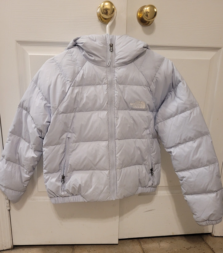 Light blue puffer jacket with a hood. Size Small. One year old, only worn a few times. Too small and doesn't fit anymore.