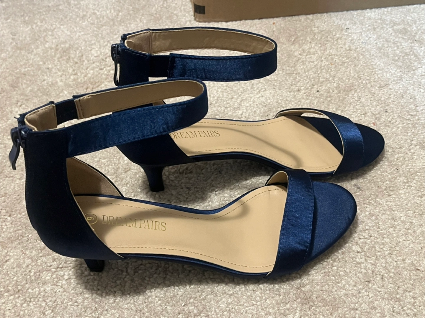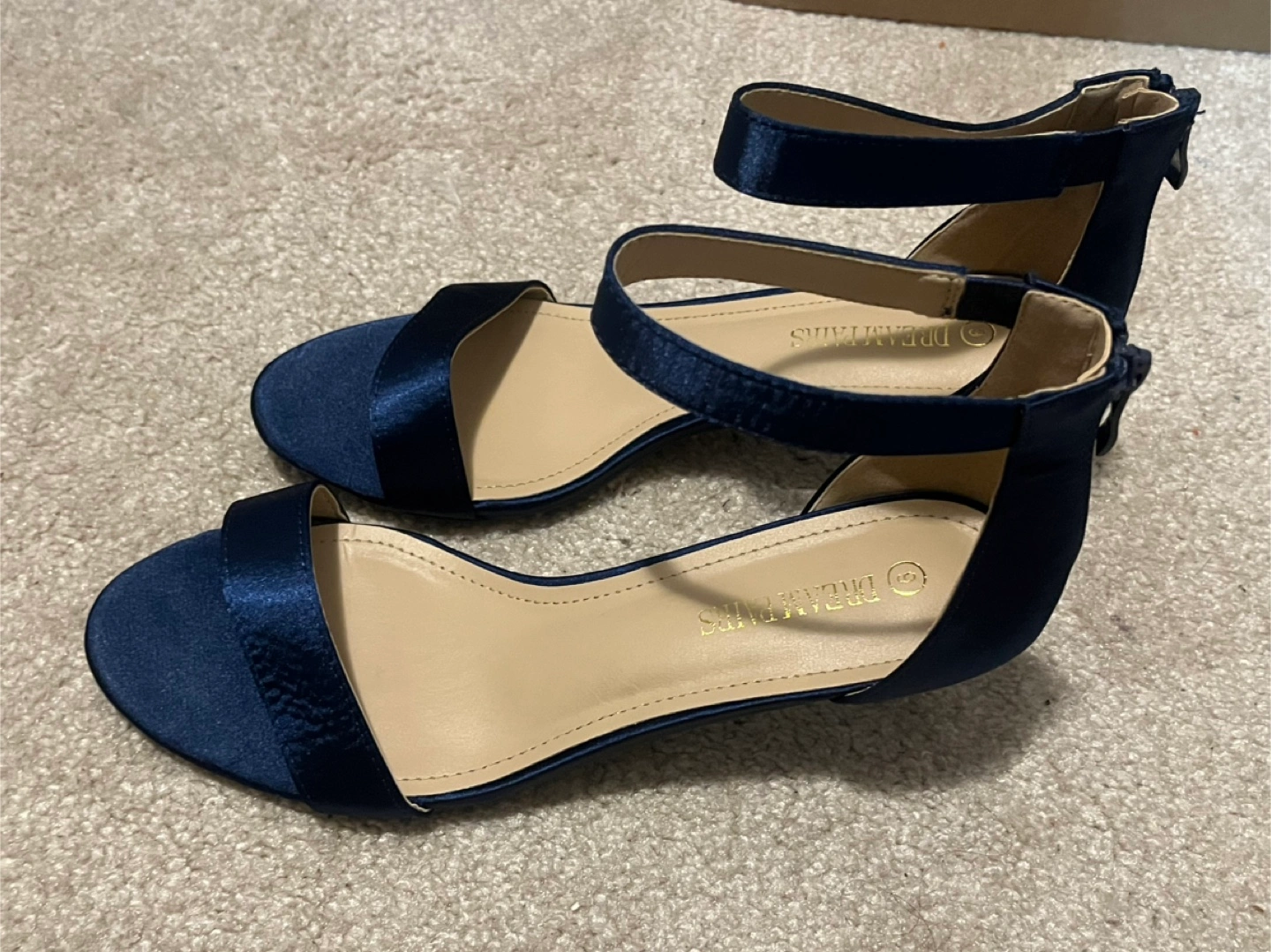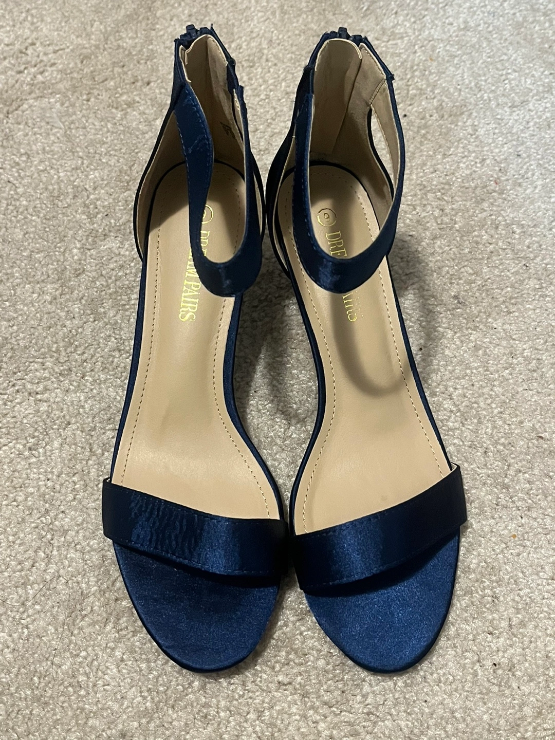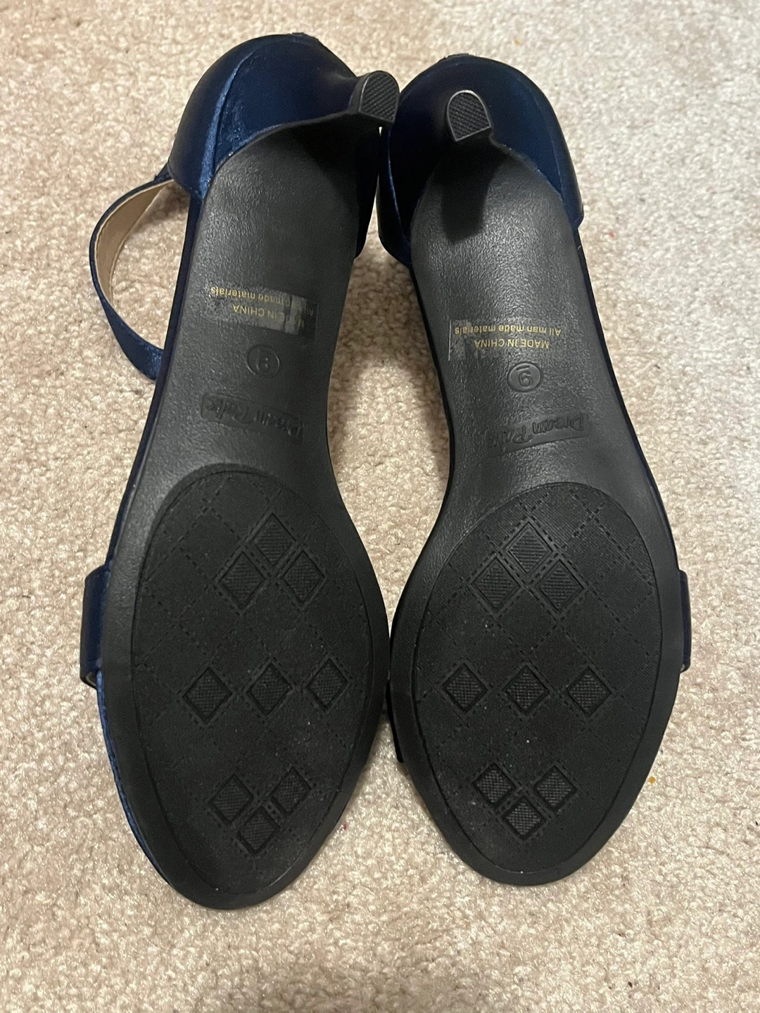 Like new condition Pickup Brampton or downtown Toronto Navy blue ankle strap heels. Low heel. Satin type of material.