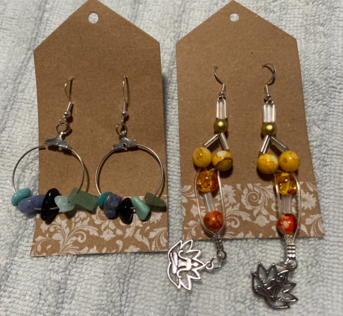 Three pairs of handmade earrings. Two pairs with stone accents and one pair with cupcake charms.