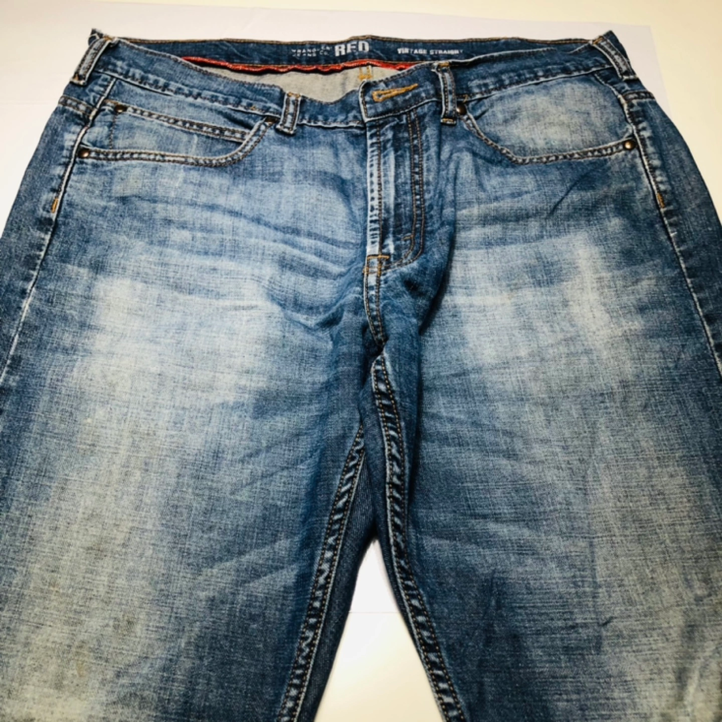 Wrangler Red Vintage Straight jeans. Relaxed fit and refined style; RED is all in the details, with red inner pockets, distressed finishes, and oversized hardware. It's a fresh take on jeans, with all the quality that comes with the Wrangler