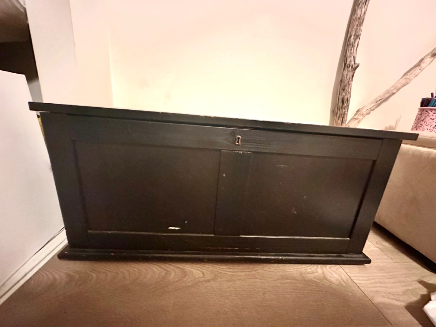 Black wooden storage chest with hinged lid and rope pull. Has a small keyhole. Don’t have the key anymore , it doesn’t close anymore . The top shows some scratches and stains. It was used !