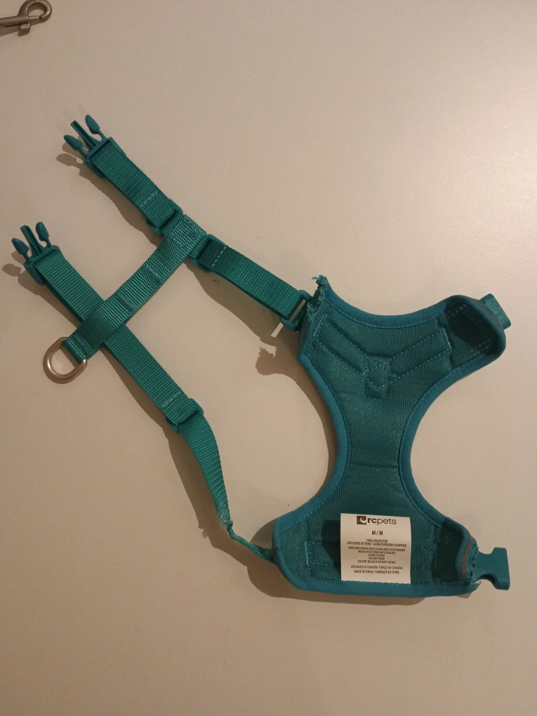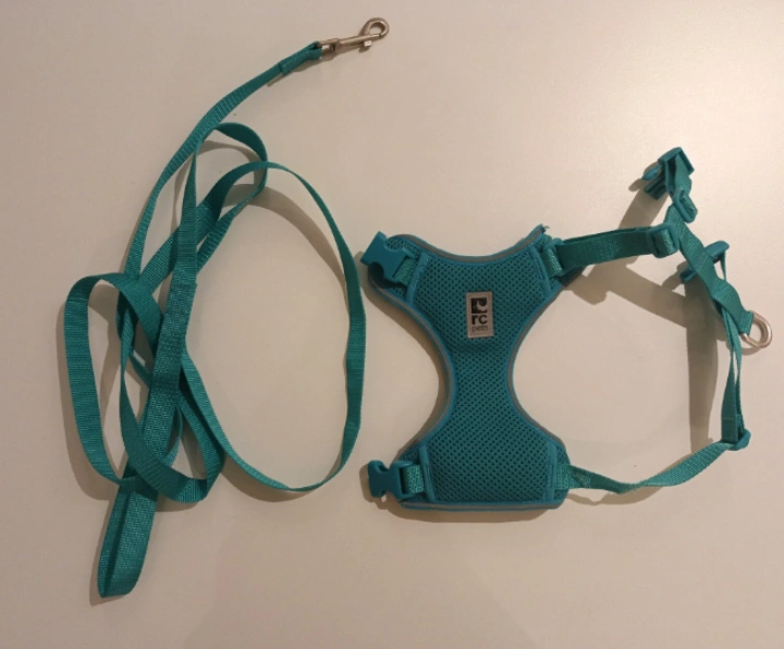 teal leash and harness. size medium. has bite marks from my cat, but I believe that it is still safe for other cats who are more chill than mine. third picture shows where the bite marks are. pls note one of the bite marks on the harness may result the harness tearing. would not recommend for very active cats. purchased last year. giving it away because my cat took a bite from the leash and i didn't feel comfortable taking her out on walks anymore (she has a lot of energy and I don't want to risk her running away). see link for more details and where I purchased it https://www.petmama.ca/products/Toronto/Rc-Pet-Products-Adventure-Kitty-Harness-Teal-4/ Please DM me telling me when you would be available for pickup. I will prioritize those who are able to meet up in my area (St. Clair ave west and Oakwood or the TTC stations St. Clair west station and Ossington station).