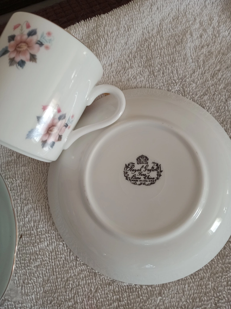 Teacup and saucer, floral design with gold trim.