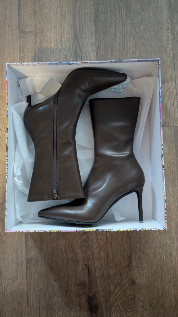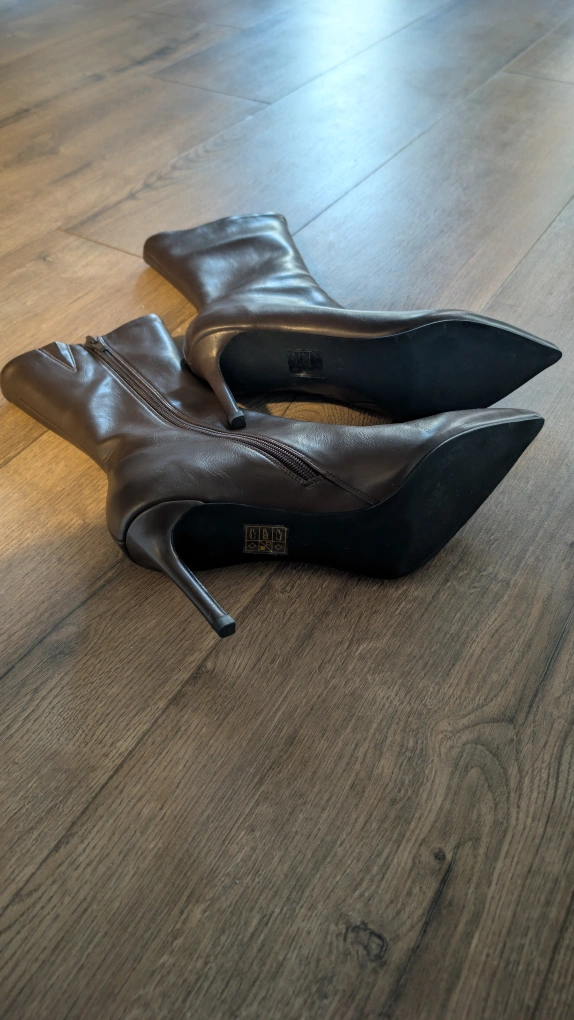 Brown leather boots with a pointed toe and stiletto heel. Zipper closure on the inside of the ankle. Worn only once!