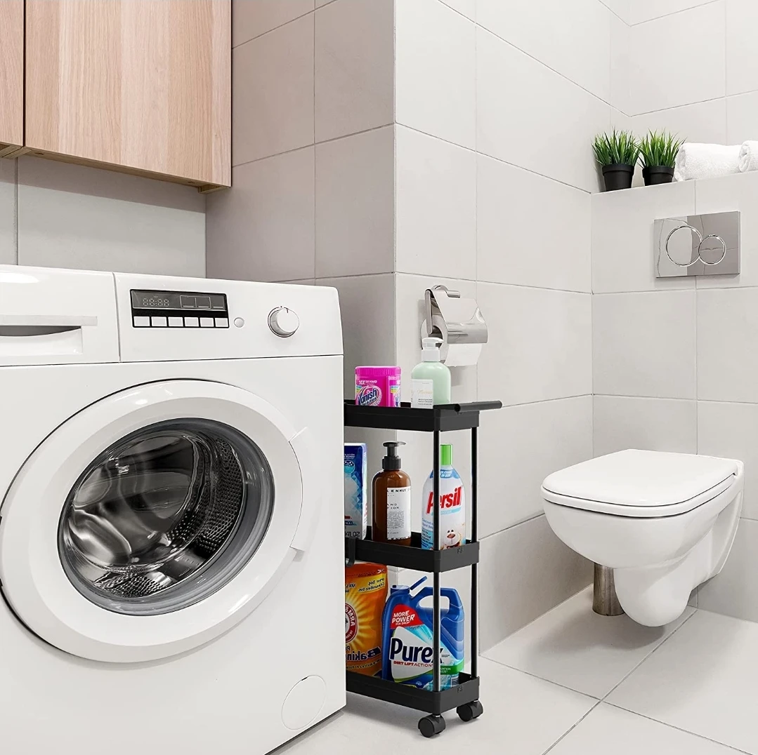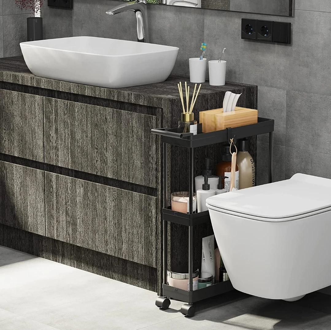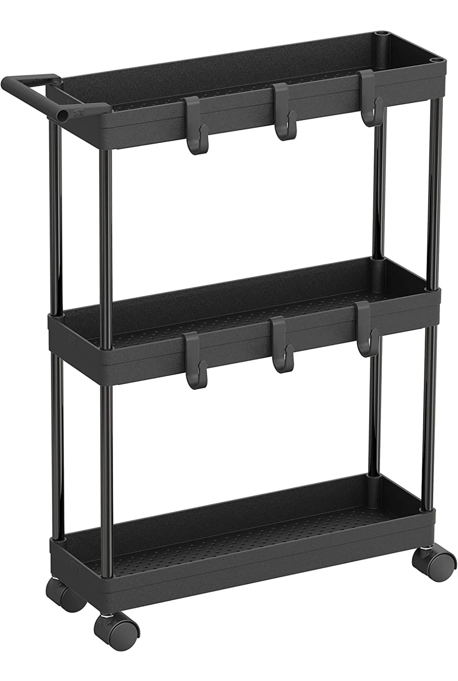 Black narrow Utility Cart in Black. On wheels, with hooks and handle for pulling if needed. Super cute, I just got two and decided to go with the other colour, so this one has not be used, only assembled. Dimensions: 5.5" D x 16.25" W x 22.5" H Pick up near Bayview and Davisville