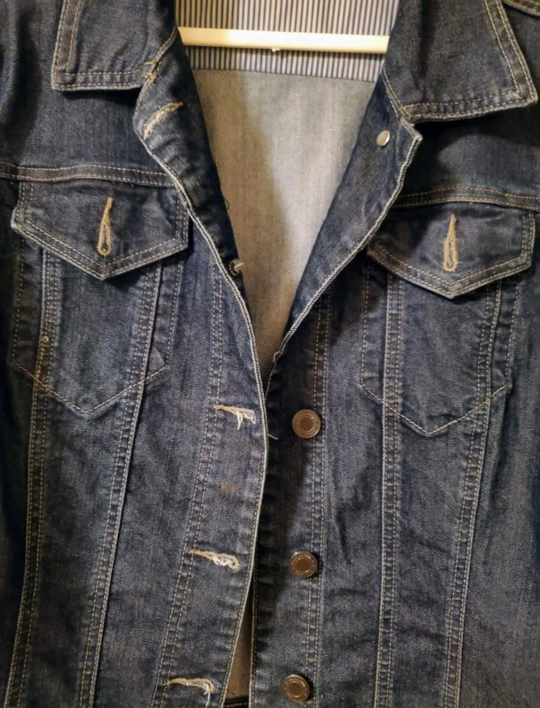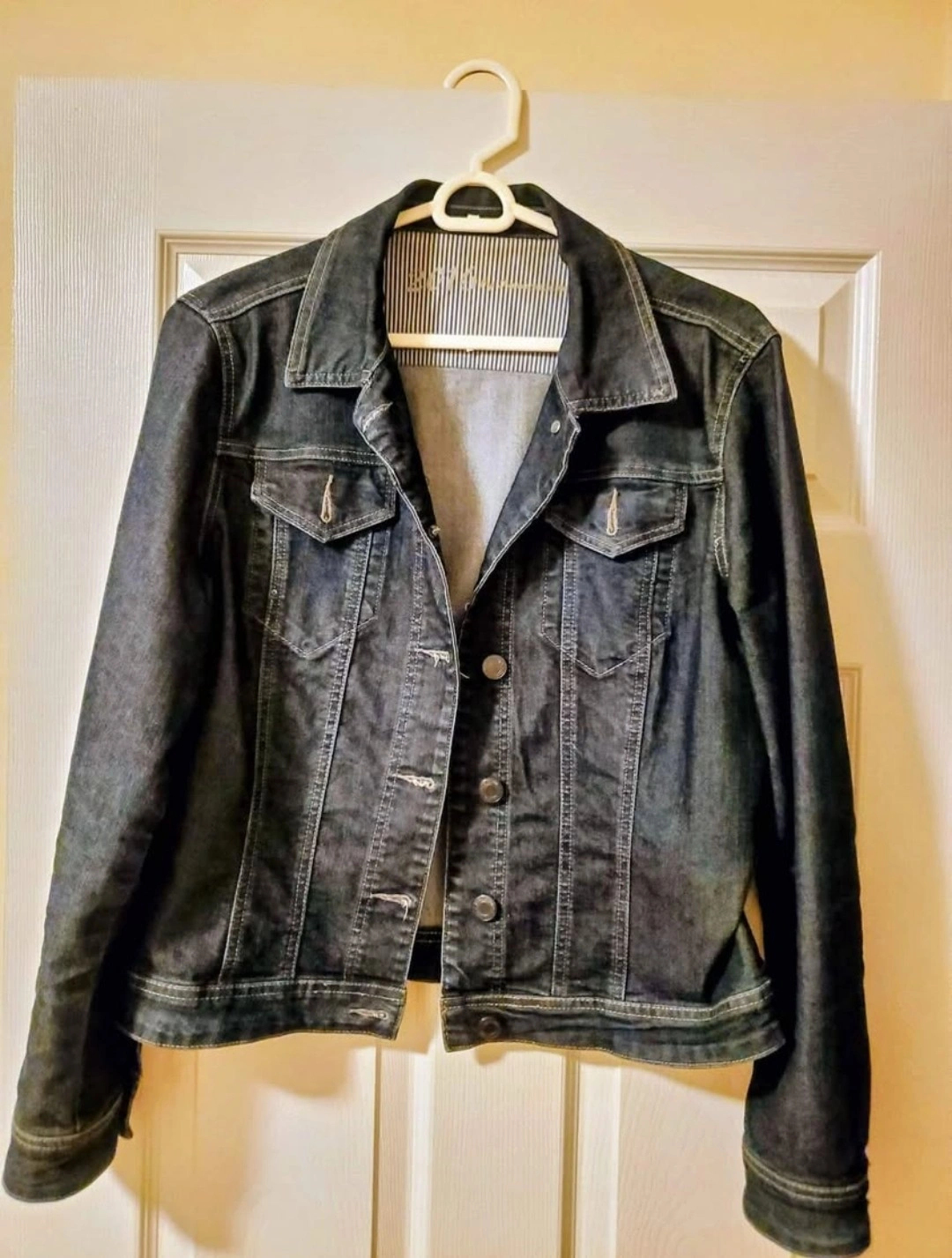 Dark wash denim jacket. Long sleeves, button closure, two front pockets.