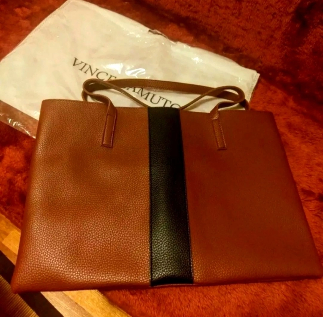 Brown leather tote bag with black stripe down the centre. Has two top handles.