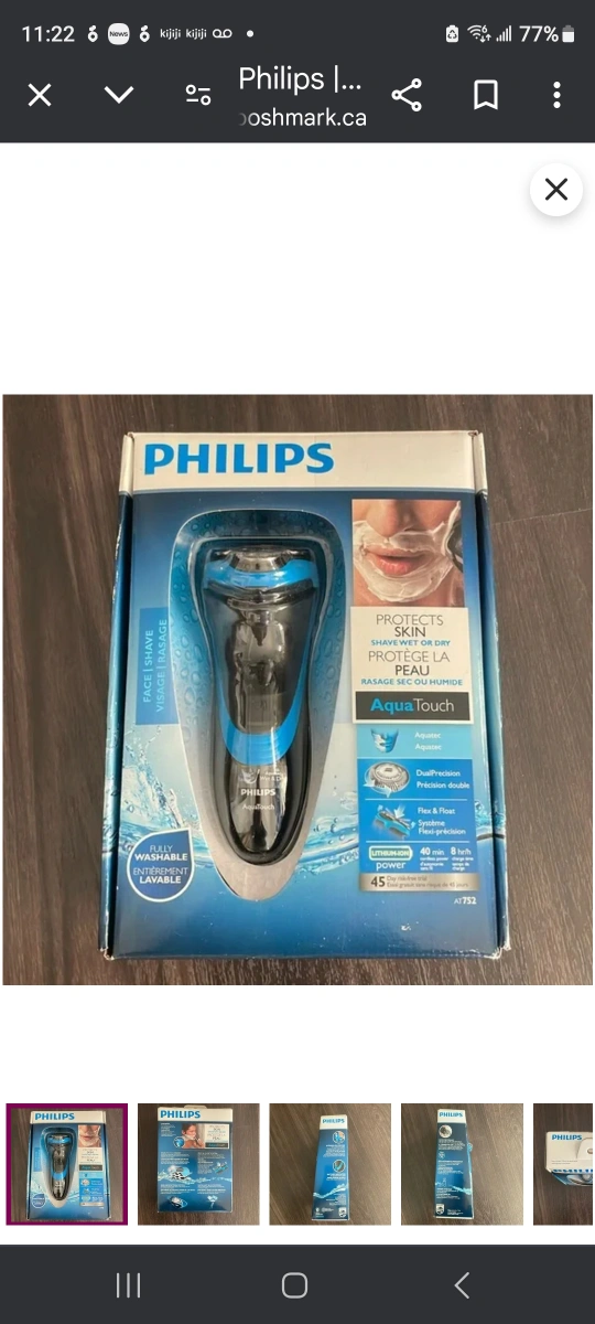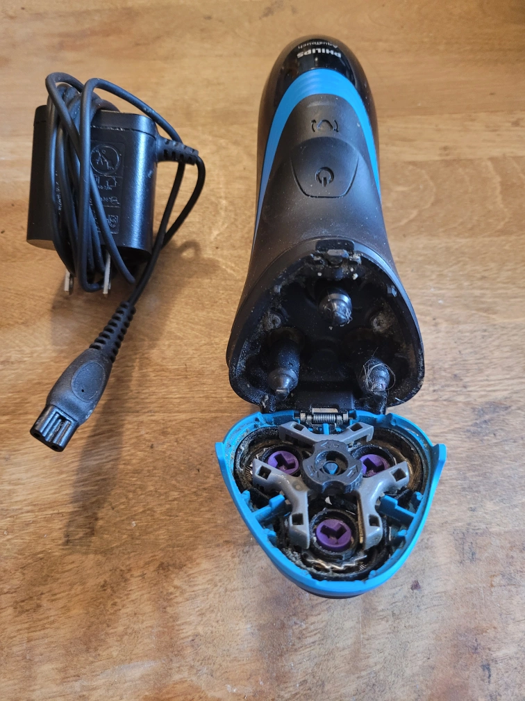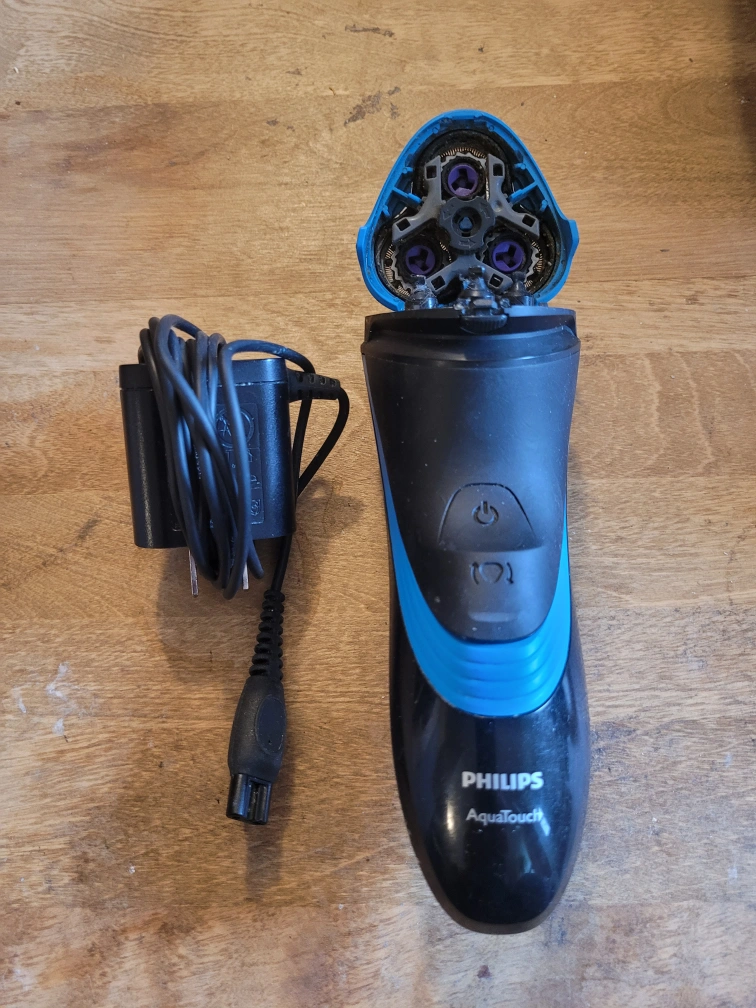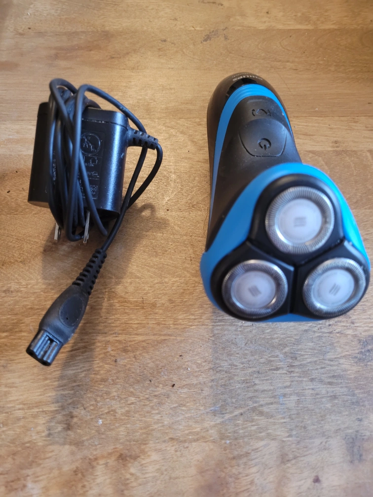 Electric razor with charging cord. Blue and black.Packaging is a stock photo. Cleaned and santized.