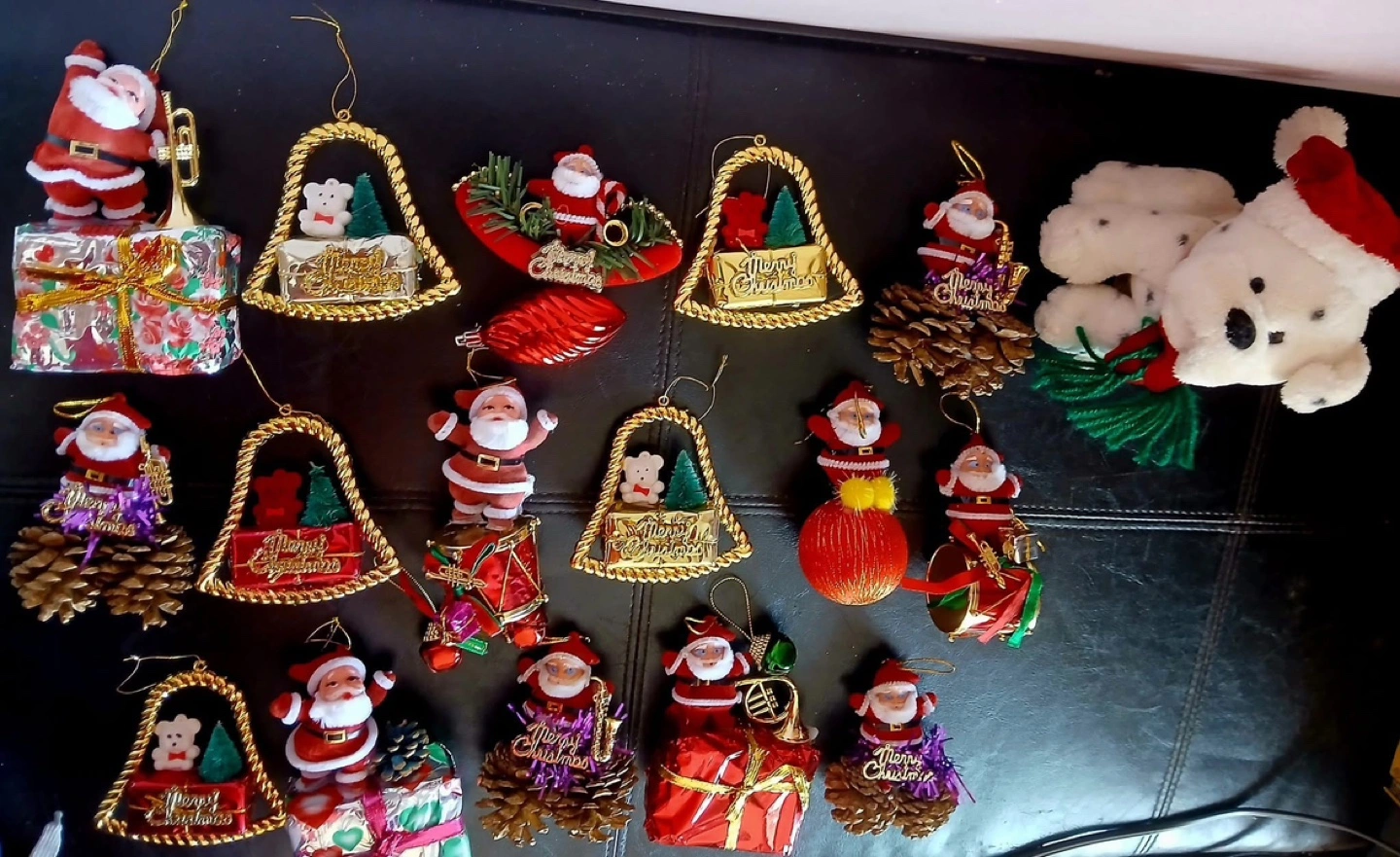 Box of free Christmas tree ornaments. Condo lobby pick up at Bayview Village, 676 Sheppard Avenue East