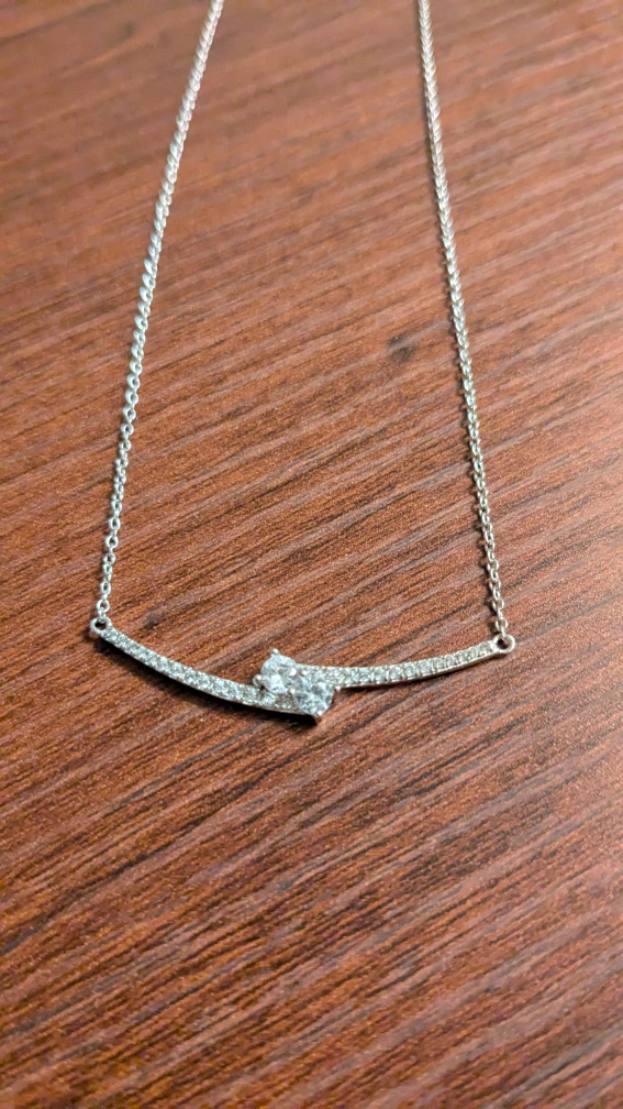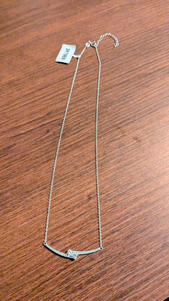 Brand: Charmed Aroma Type: Elegant silver necklace featuring a sleek bar diamond-studded pendant. Perfect for adding a touch of sophistication to any outfit. Colour: Silver Size: One size fits all (O/S) Value: appraised at $140