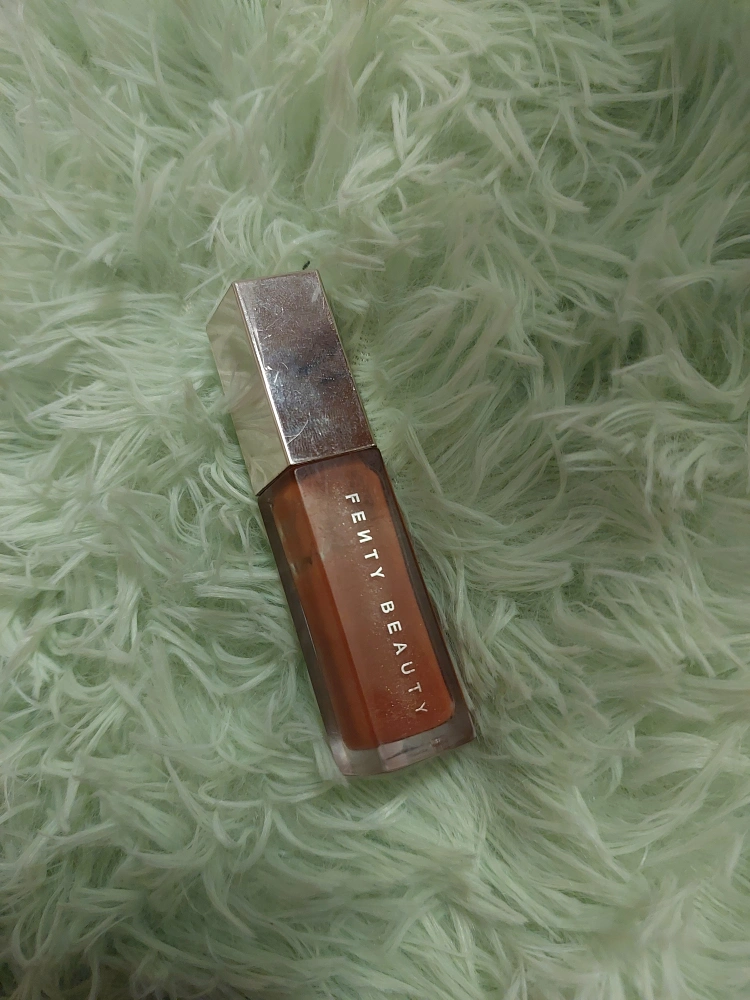 Lip gloss in a clear tube with a silver cap. The gloss is a shimmery brown colour.