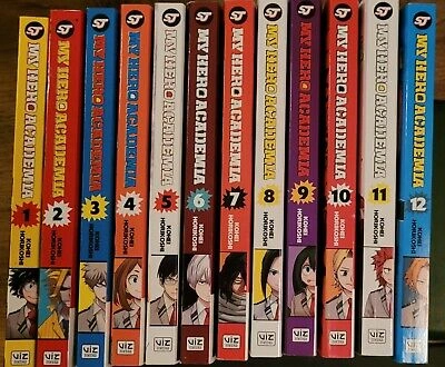 1 book for 5 each or 30$ for all Complete set of My Hero Academia manga. Volumes 1 through 12. fair condition not all books are included some are already sold 3 each