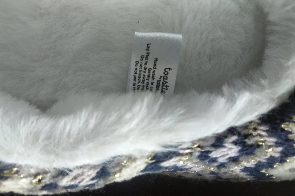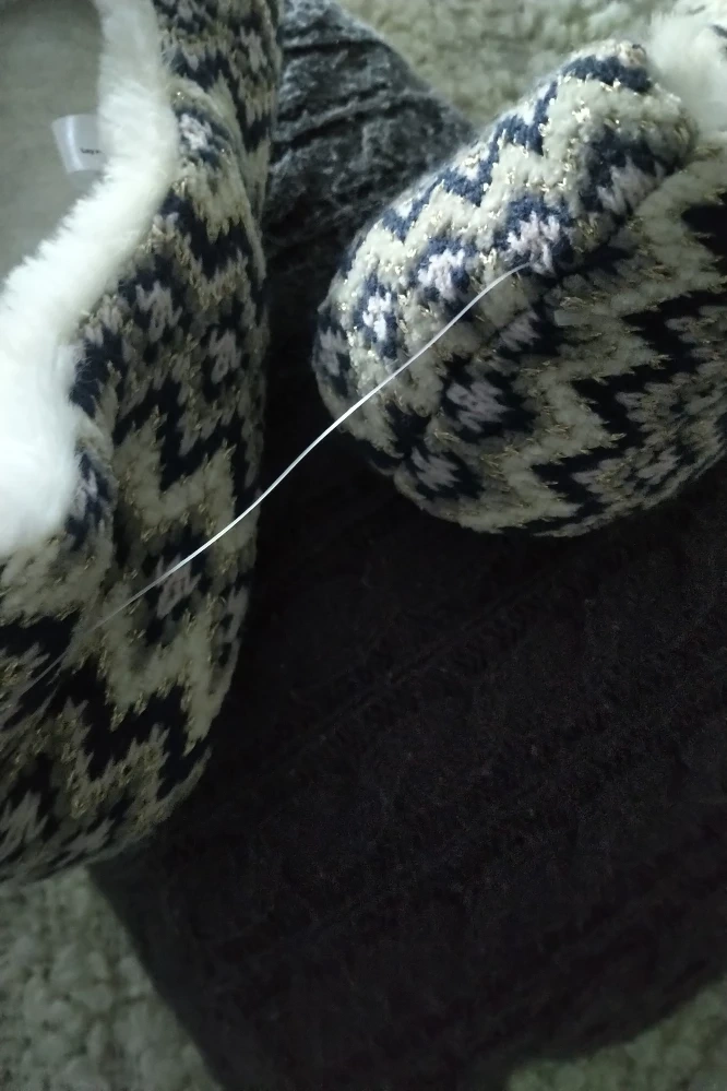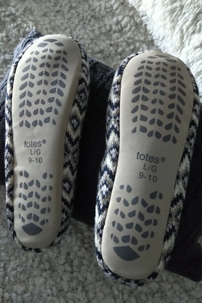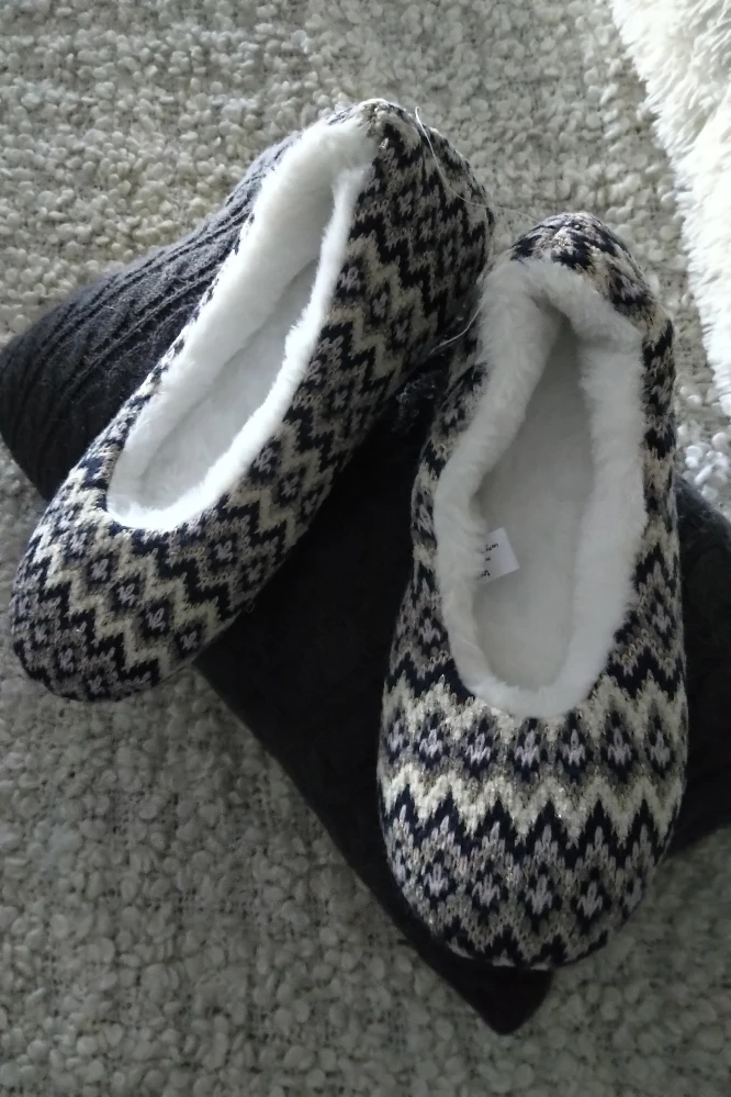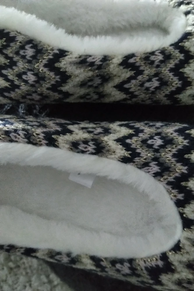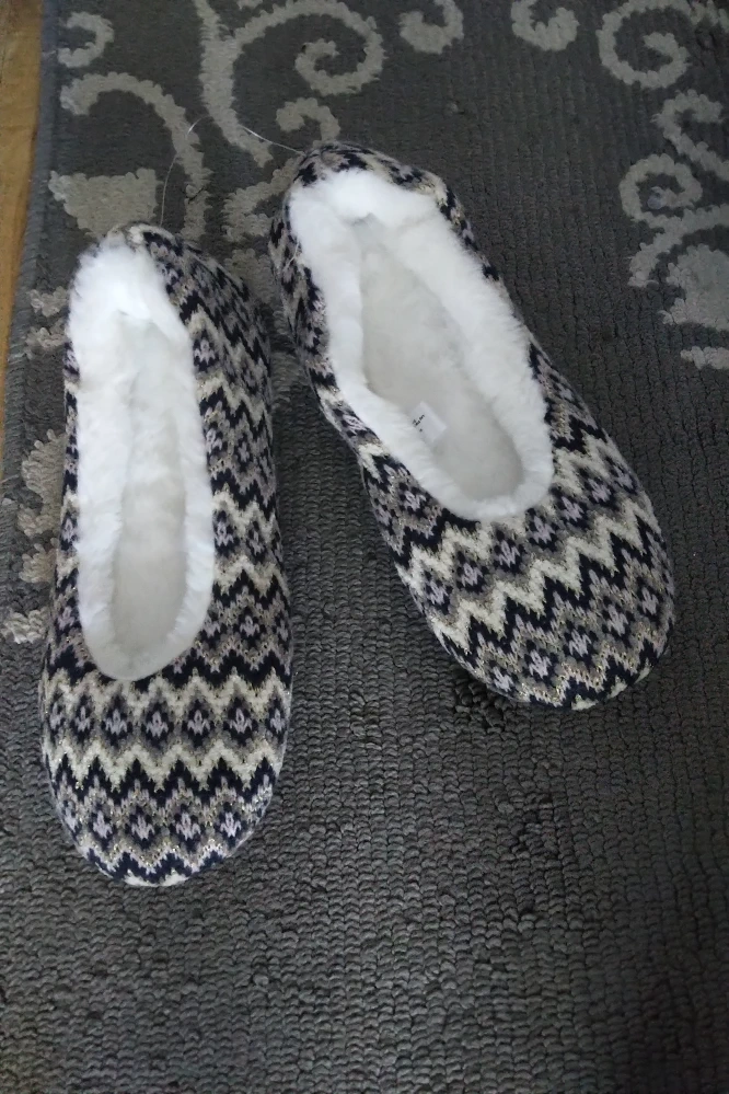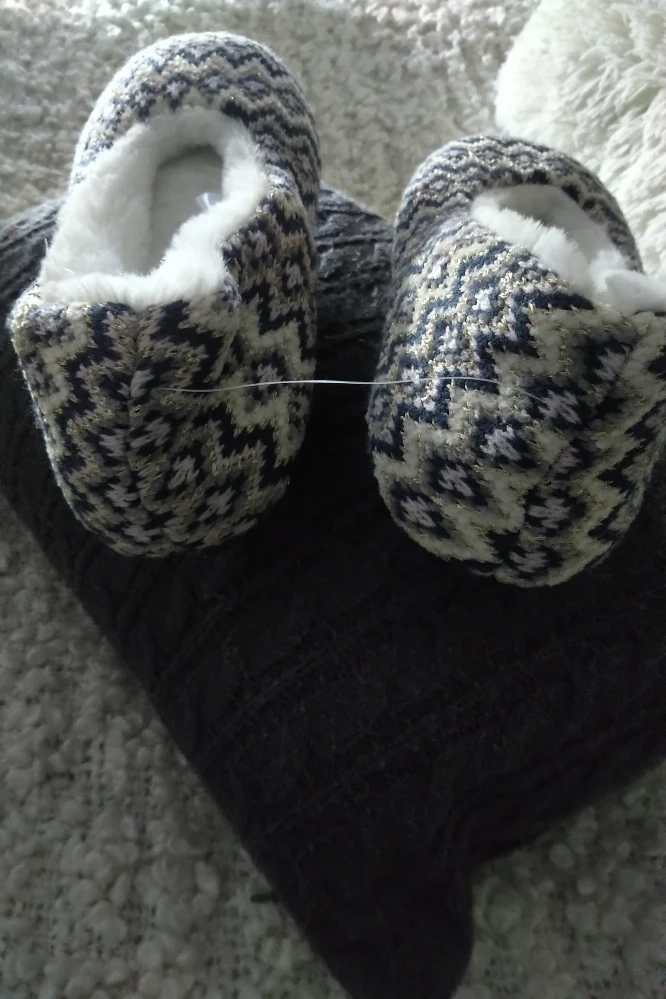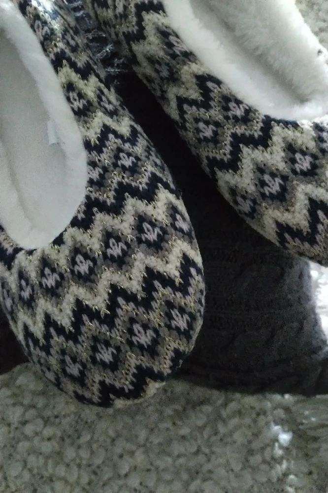 Women's slippers. Knit upper with a fuzzy interior. Chevron pattern in navy, cream, and gold. Lightweight and comfortable. brand new and still attached as shown in pictures😉 very cozy and warm not to mention super cute!! pick up Weston rd@401 may accommodate at various locations within distance only. ☺️