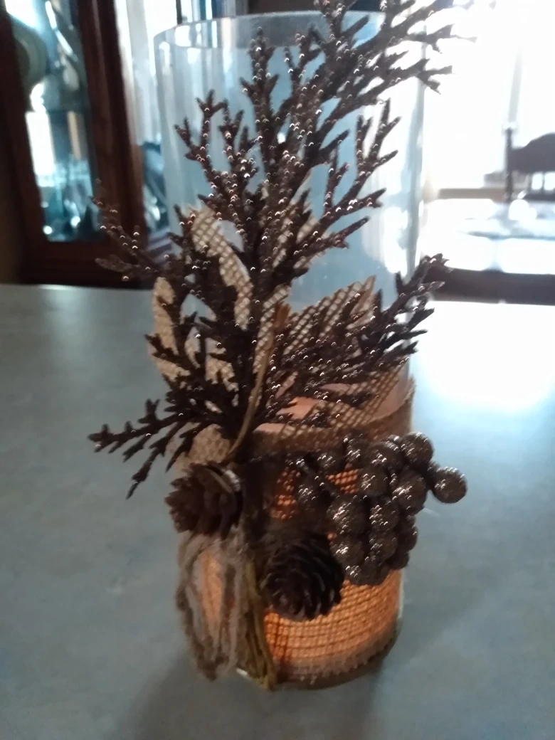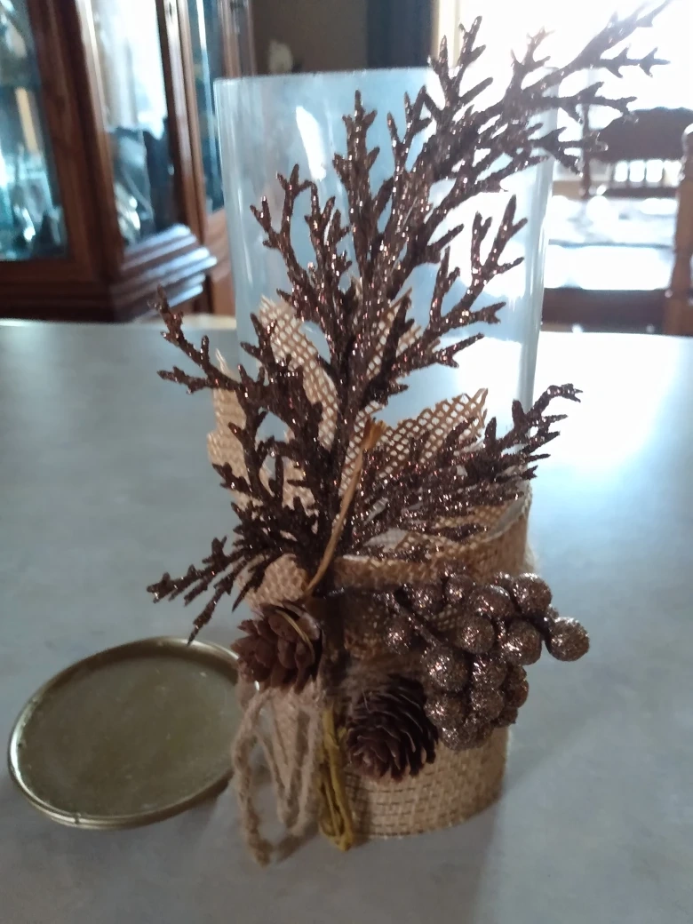 Glass candle holder decorated with burlap, pine cones, and glittery branches. Perfect for fall or winter decor. Includes a matching base