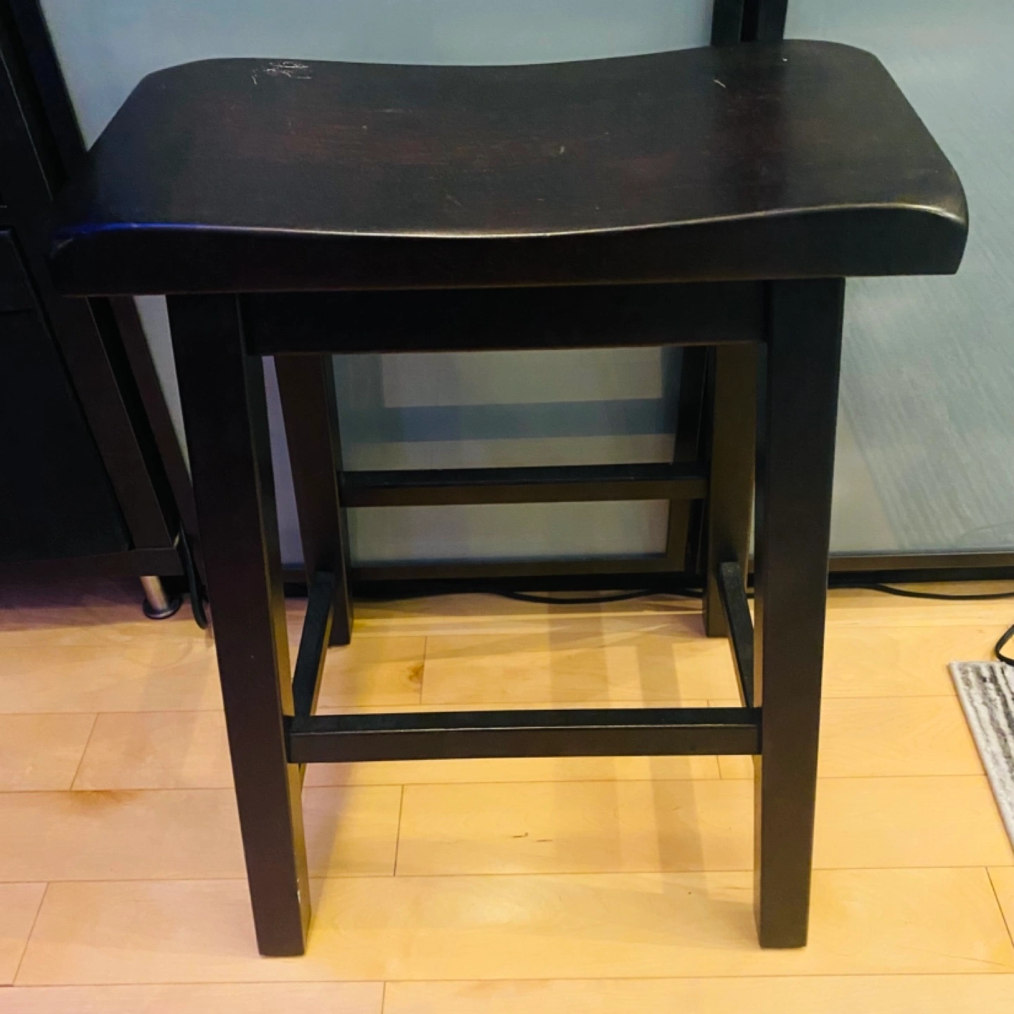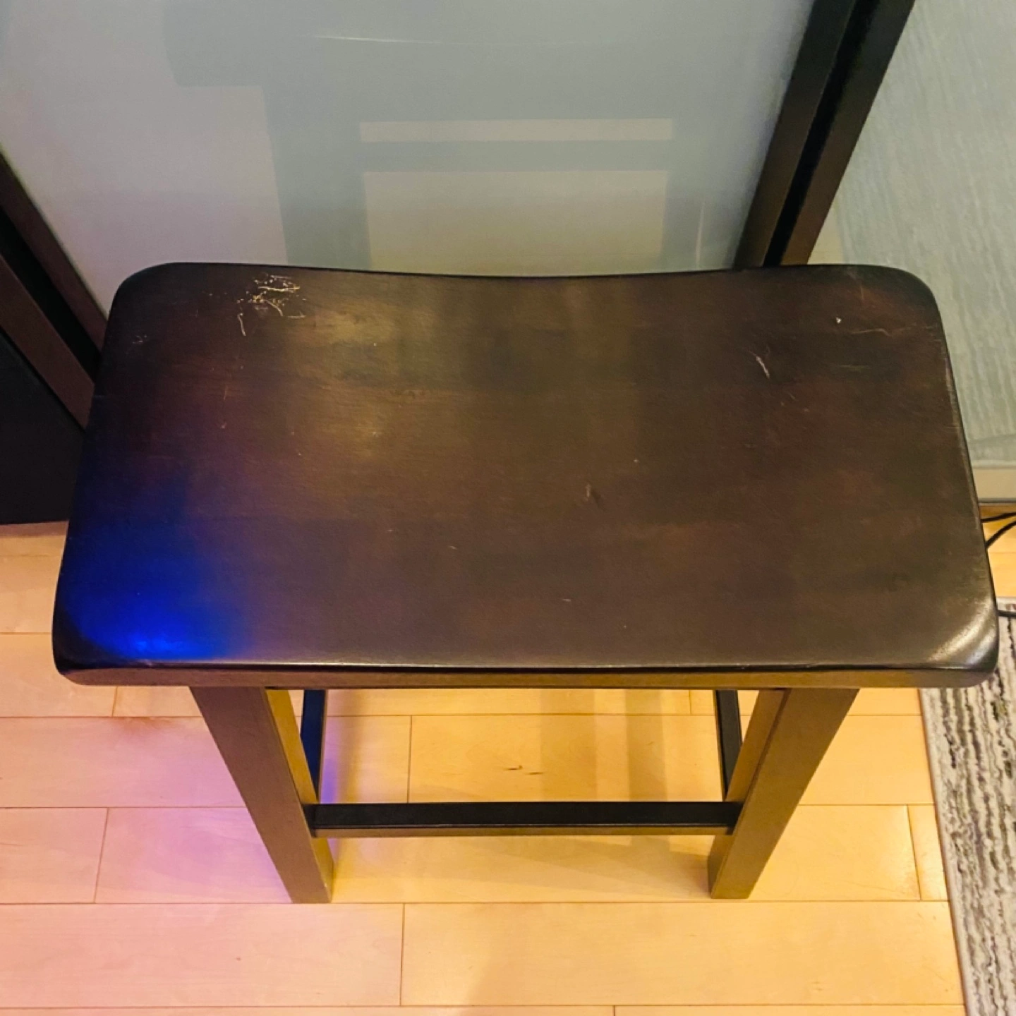 A solid wood bar stool in dark brown/black stain. It is a comfortable height for a standard table or desk. Slides under most IKEA furniture and tucks away nicely. The seat is curved and very smooth for comfort. The stool has a few minor scratches and scuffs but nothing significant. See all pictures for details. Very sturdy, can also be used as a couch side table or nightstand. Measurements: 24 inches tall 18 inches long (at top, seat) 9 inches wide (at top, seat) 11.5 inches wide (at bottom rungs) #stool #bench #chair #seat #furniture #wood
