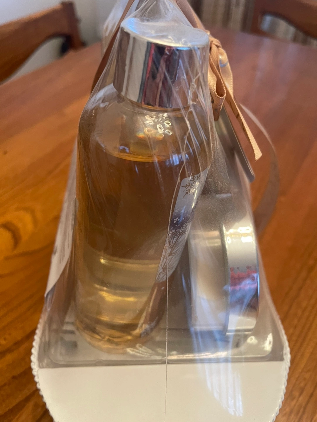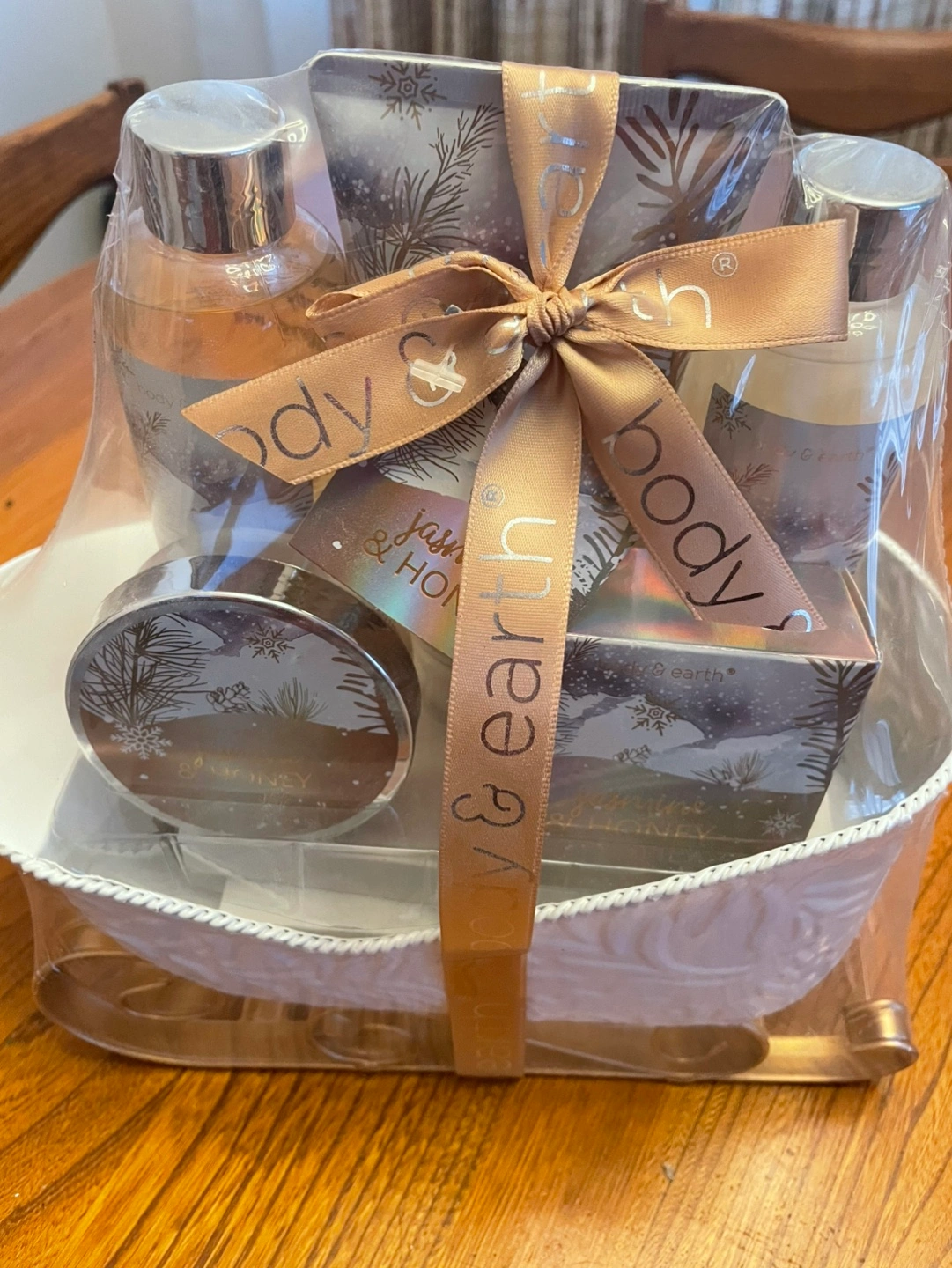 New, unused Jasmine & Honey gift set. Includes body lotion, shower gel, hand cream, and candle. Packaged in a decorative sleigh. Perfect gift!