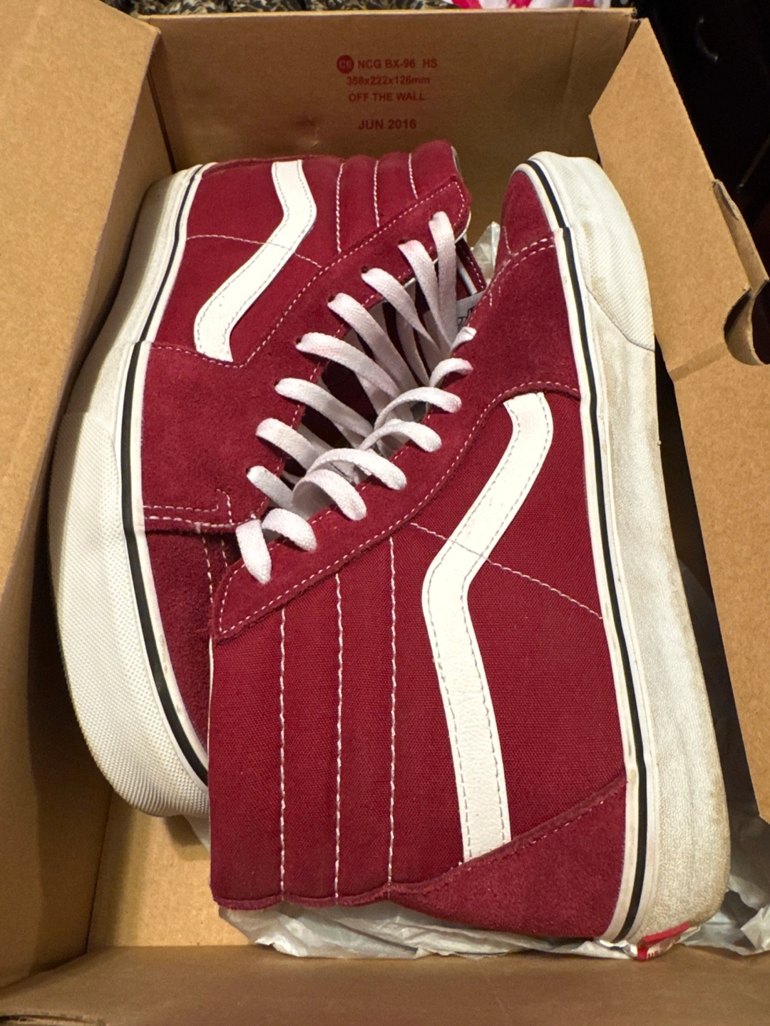 Men's size 11 Vans Sk8-Hi high-top sneakers. Rumba Red/True White colourway. In original box. Pre-owned.