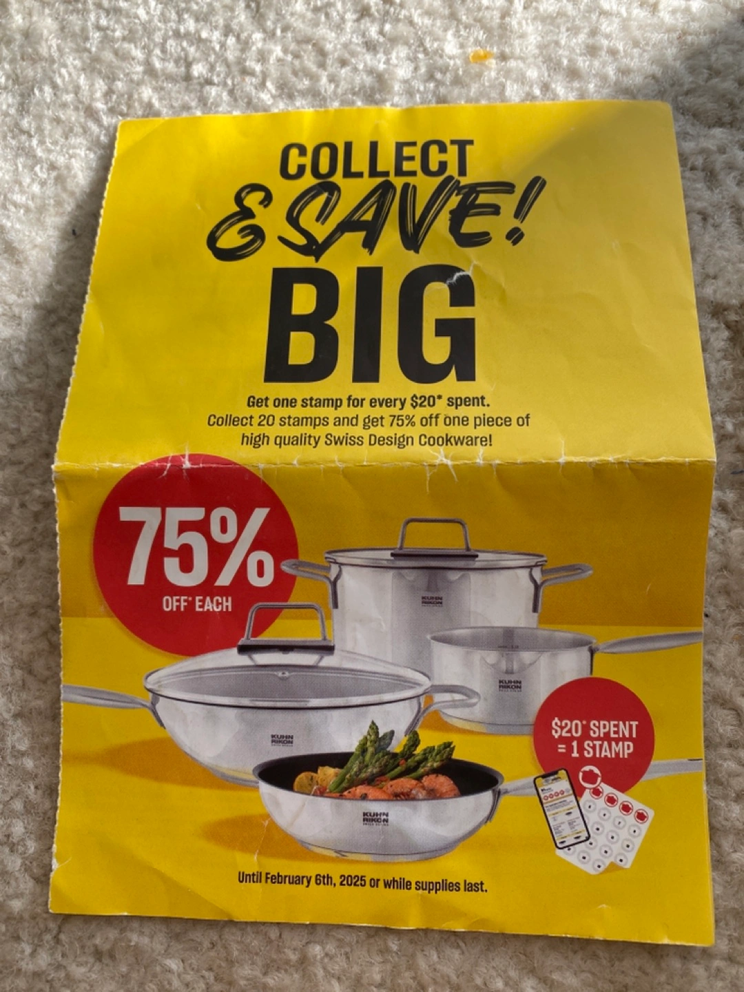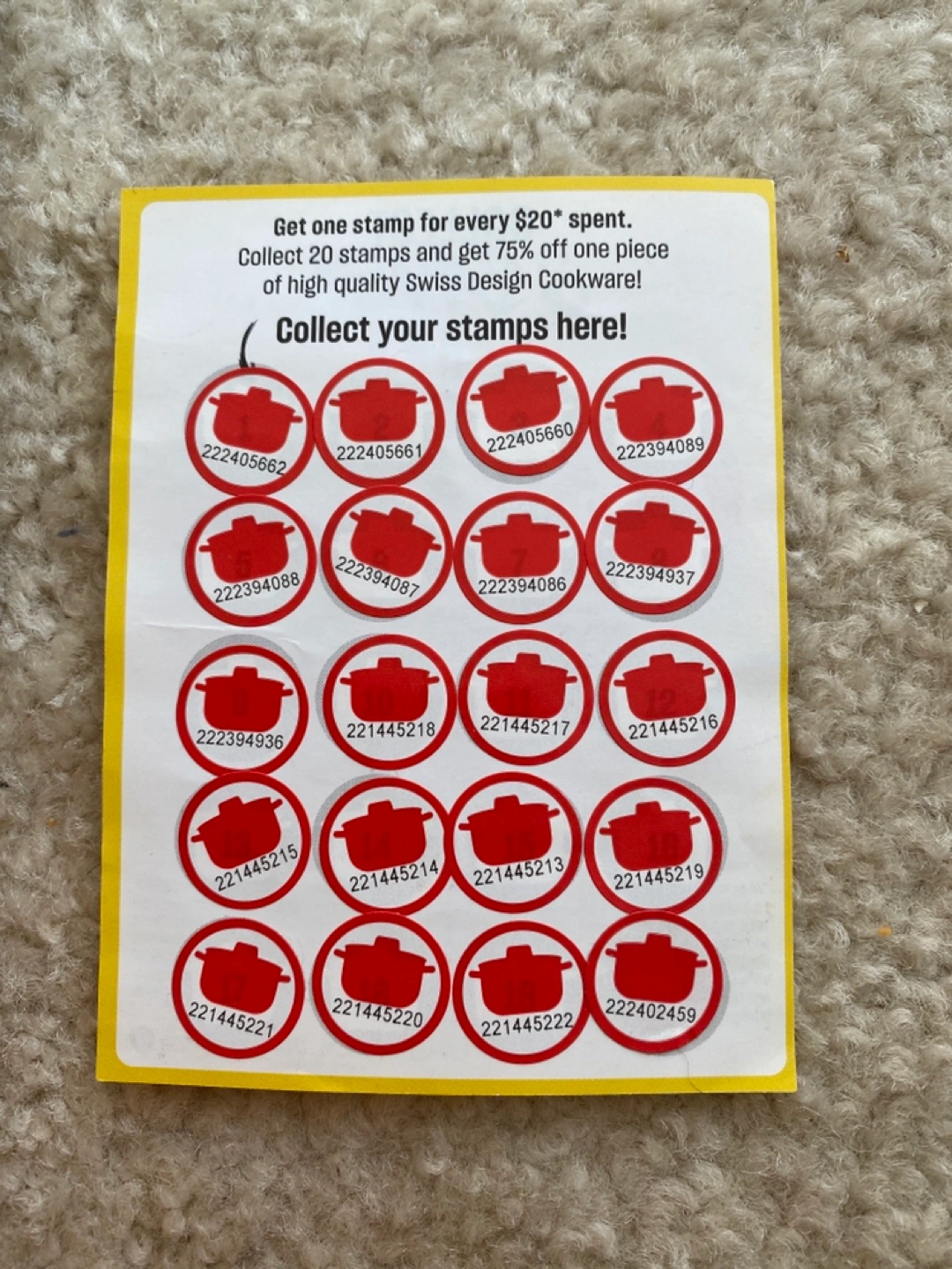 Collection of stamps for 75% off Swiss Design Cookware. Valid until February 6th, 2025, or while supplies last. Get one stamp for every $20 spent. Collect 20 stamps. Pick up near steeles and Bathurst