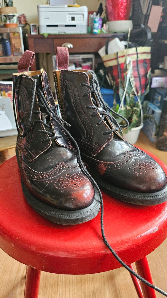 Women's Dr. Martens brogue boots. Burgundy leather. Lace-up and side zip. Wingtip detail. Worn twice. I have way too many pairs of boots! These are gorgeous. Great find! Available for pick-up near Oakwood Village.
