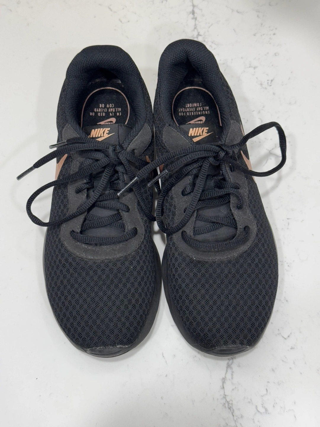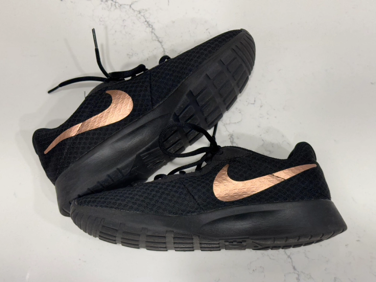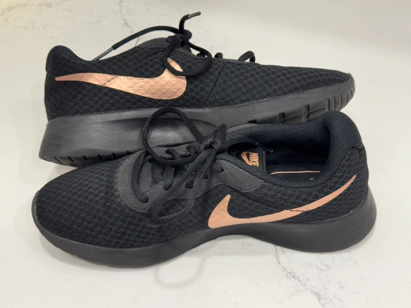 LIKE NEW Nike WMNS 7 Tanjun Runners **NO TRY-ONS** In great condition! Classic Nike trainers with a pink metallic swoosh. Only worn once or twice indoors. Super lightweight, airy and comfortable. The perfect gym shoe! Bought for $135+tax. No try-ons (for obvious hygiene purposes) so please make sure they will fit your shoe size before arranging a pickup. They fit relatively TTS but the fit can be adjusted with the laces. Price is firm, cash only please. Pickup downtown Toronto/Jarvis & Gerrard/Yonge & Dundas or we can arrange to meet along TTC line 1.