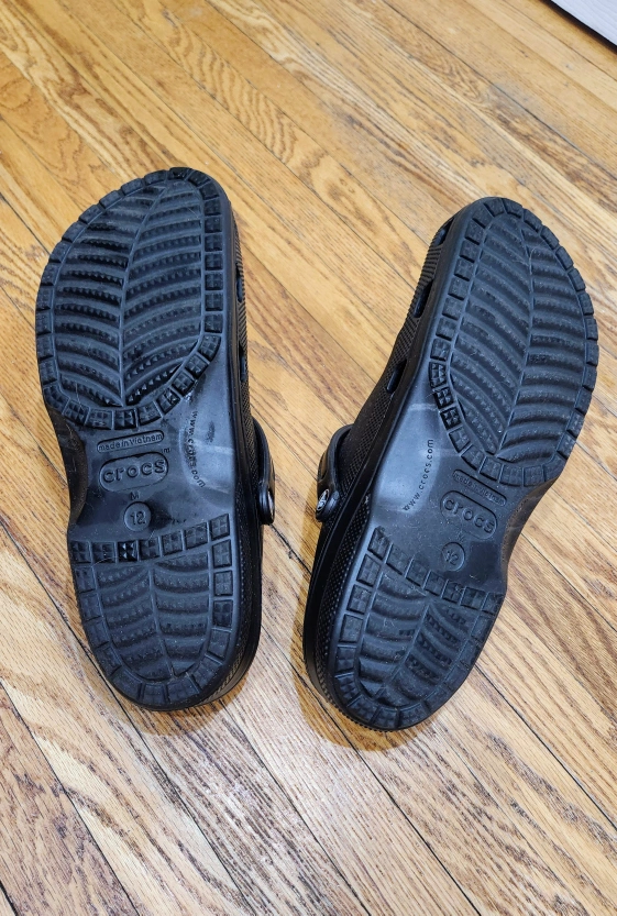 Men's black Crocs classic clogs. Size 12. Good condition. Comfortable and versatile footwear.
