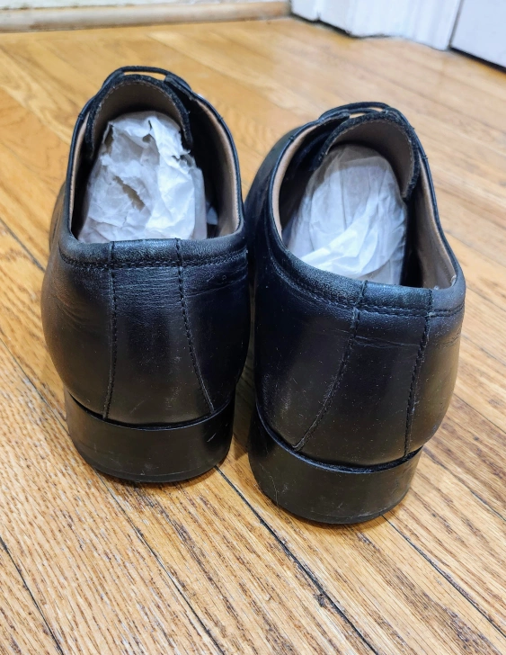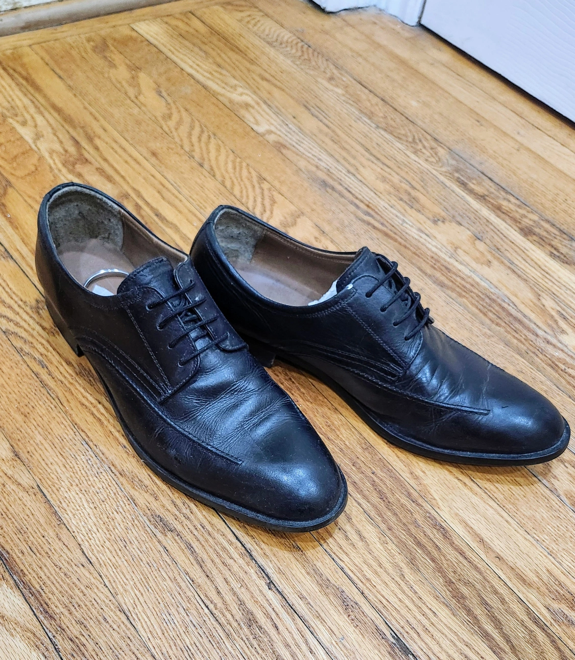 Pair of black leather oxford shoes. Lace-up closure. Slight wear. Good condition.