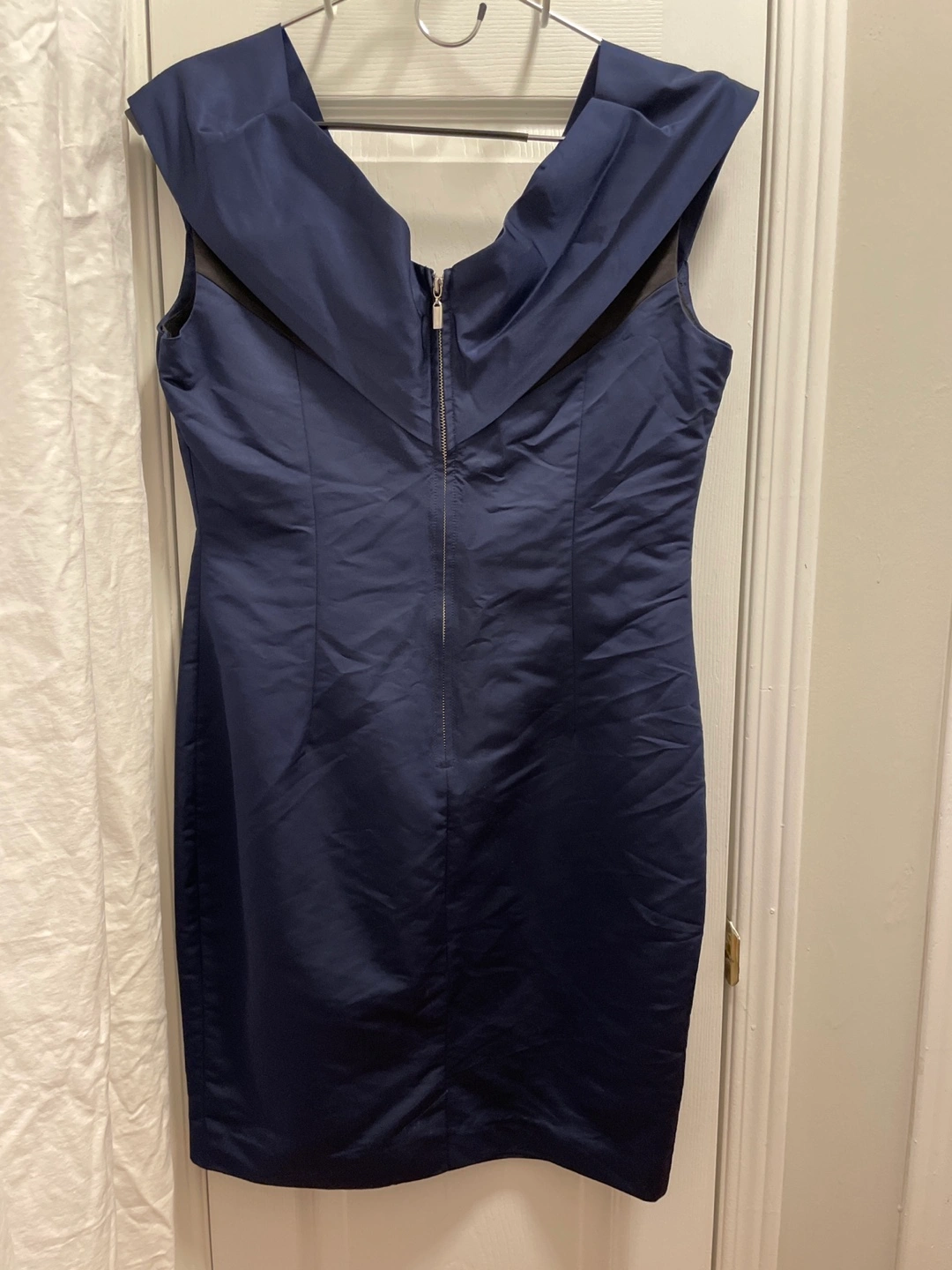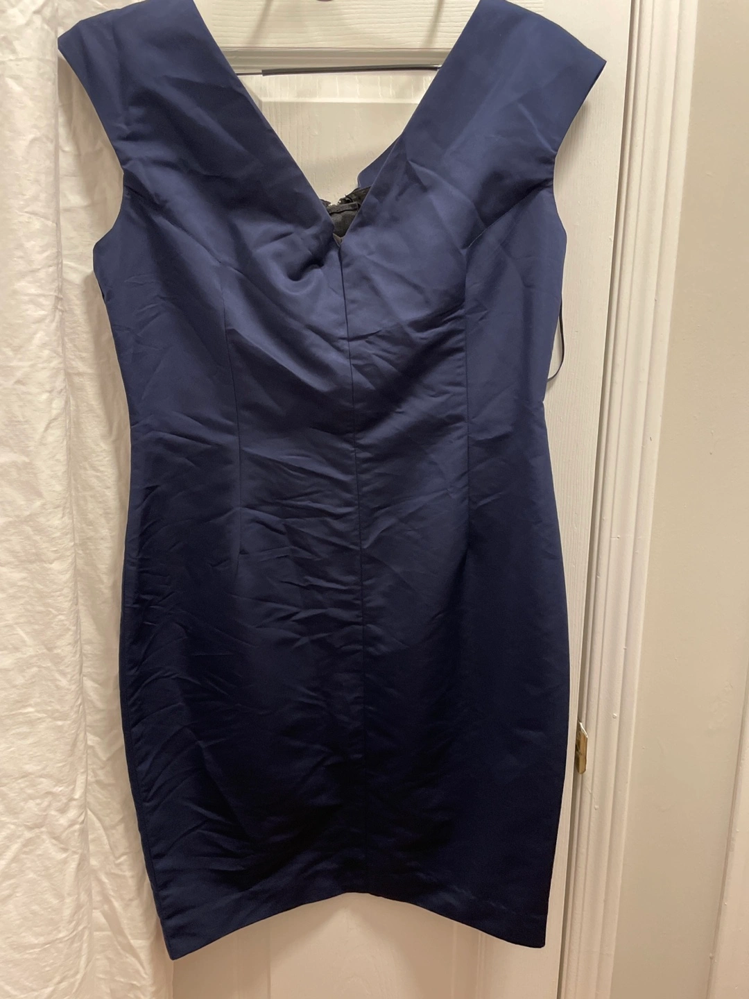 Beautiful navy blue sheath dress. Features a V-neckline and cap sleeves. Back zipper closure. Perfect for a special occasion or work event. Was purchased for an event that in the end I didn’t get to attend. Has been in my closet and it’s time to find this dress a new home