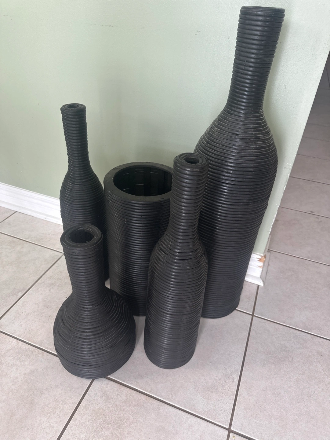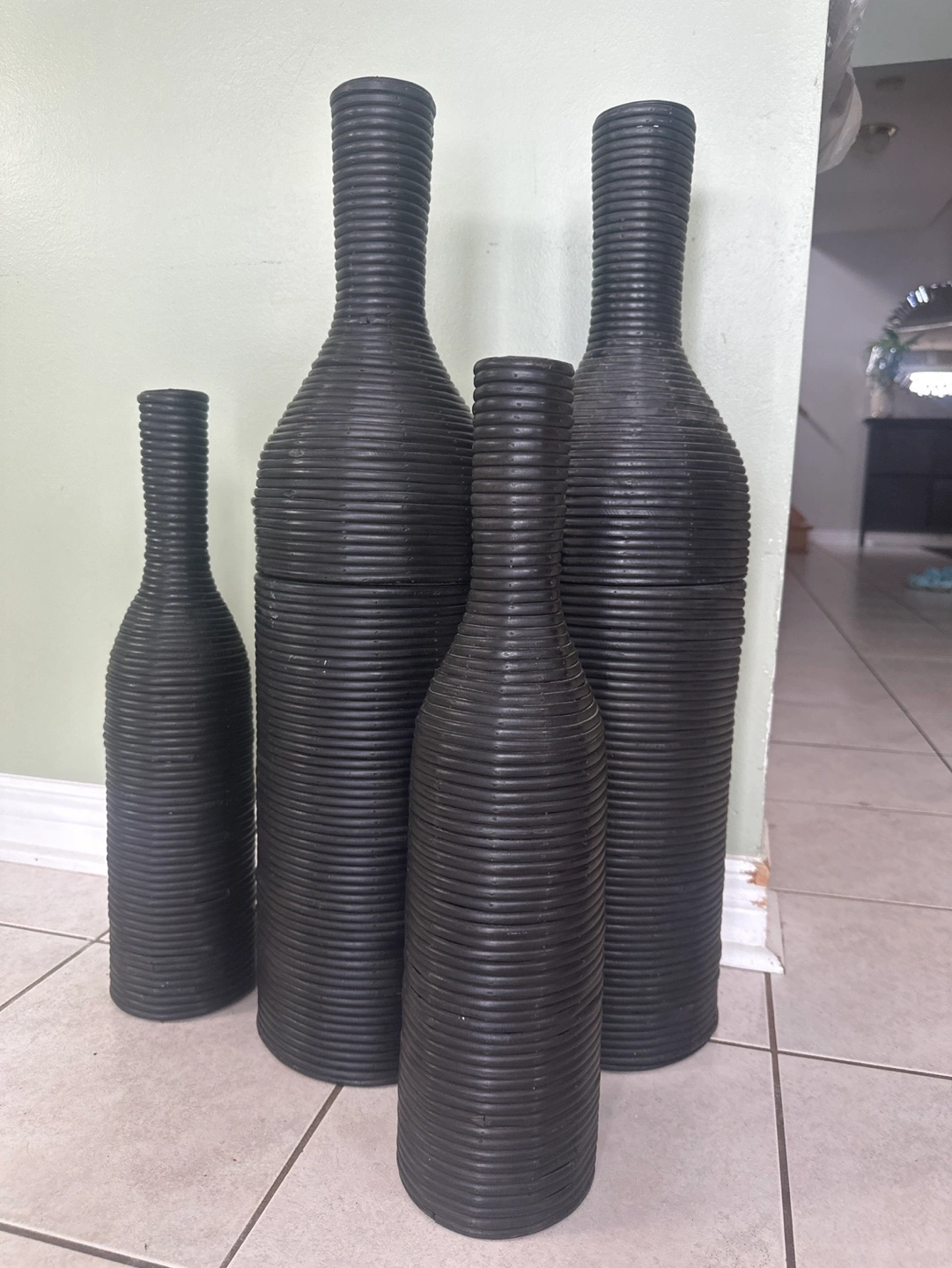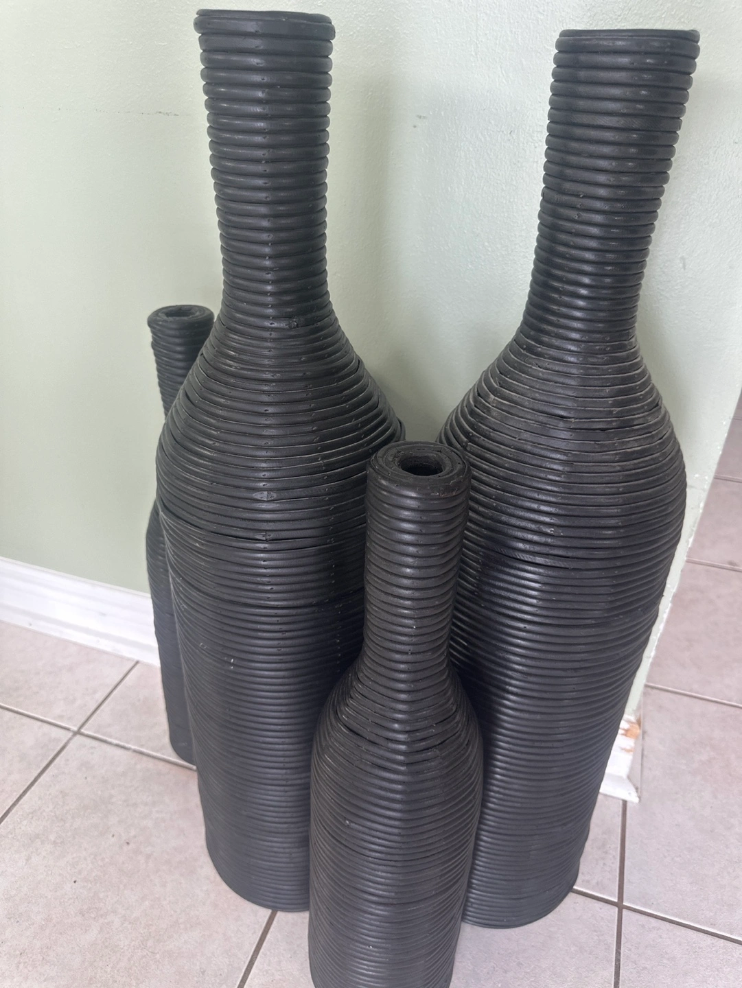 Four black vases, varying in size. Woven design. Perfect for home decor.