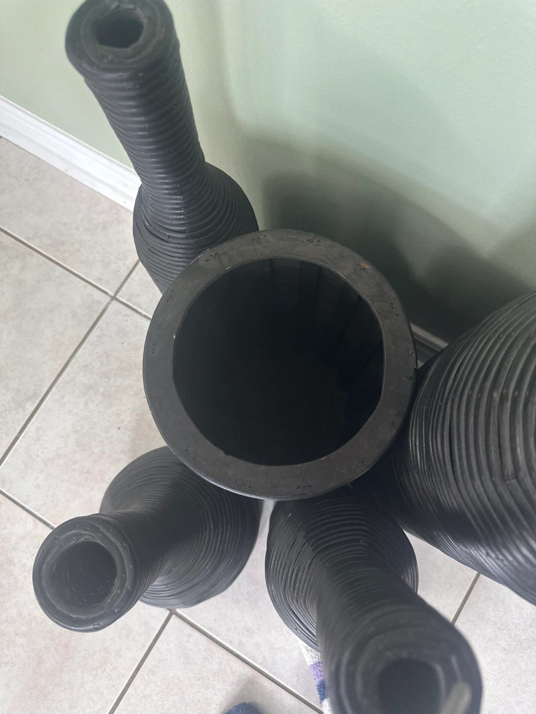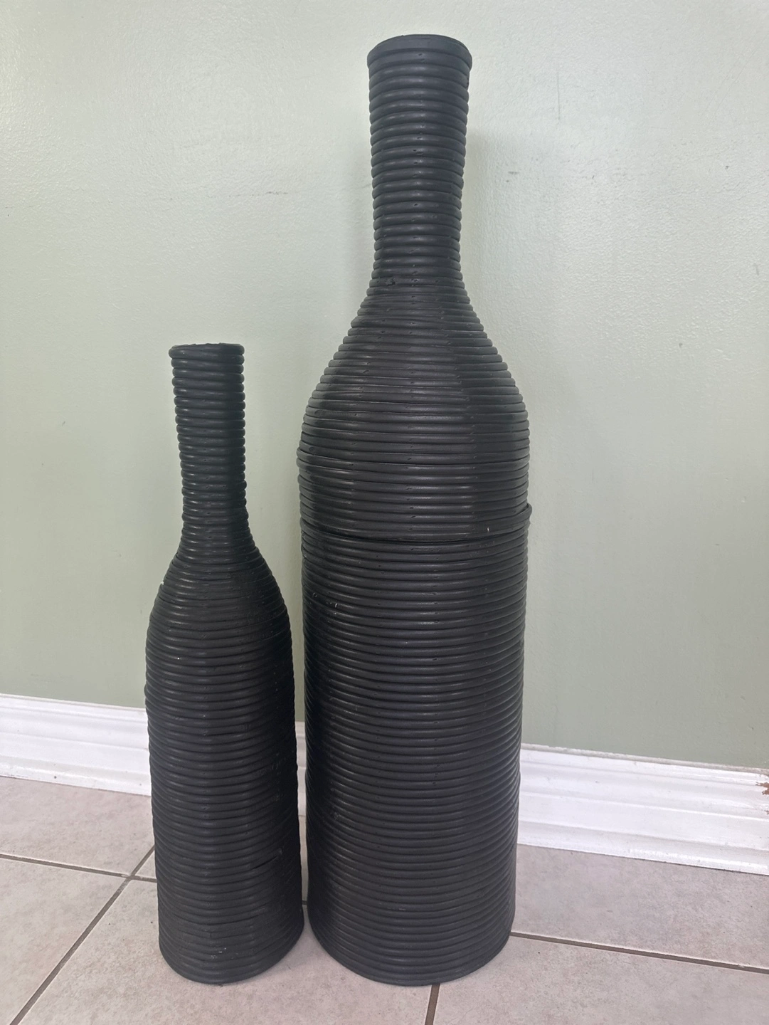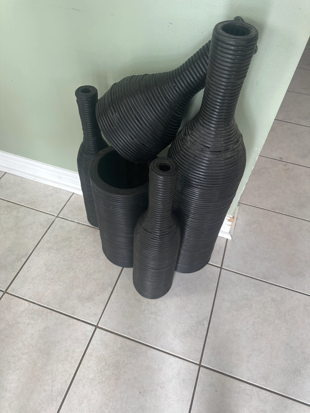 Four black vases, varying in size. Woven design. Perfect for home decor.