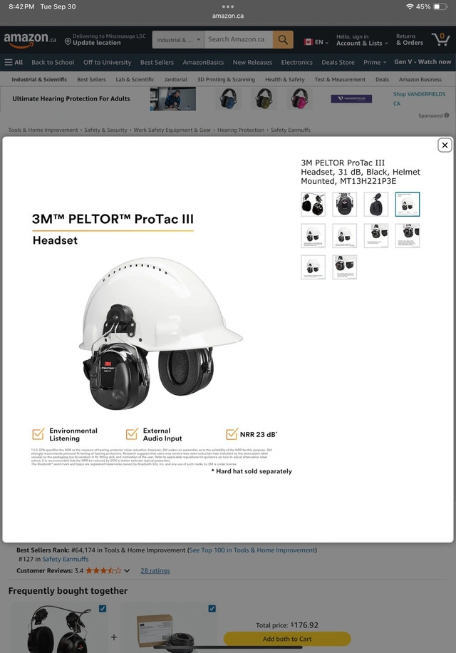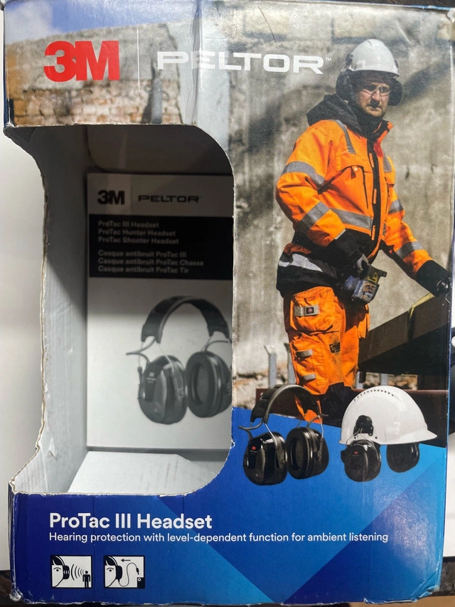 3M PELTOR ProTac III Headset, 31 dB, Black, Helmet Mounted, MT13H221P3E 3M Peltor ProTac III Headset, designed for ambient listening and clear communication in noisy environments. It features level-dependent functionality, suppressing loud noises while amplifying quieter sounds, improving situational awareness. Professional-quality hearing protection (23dB Nrr) Environmental microphones for level-dependent hearing protection and ambient listening 3.5 mm listen-only stereo input for connection to external devices (E.G. Cell phone, two-way radio, iPod) Voice guided menu system for ease of use and adjusting settings Auto power off, the headset will turn off after 4 hours of non-use to save battery Pickup can be arranged in Brampton, Mississauga, Oakville, Burlington, Hamilton