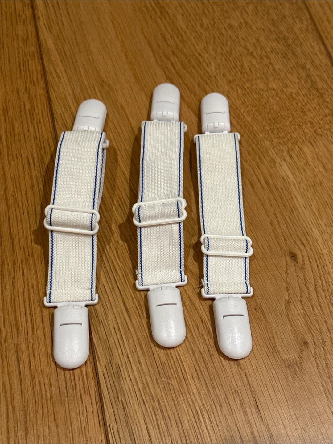 Selling a set of three bed sheet fasteners! These are white elastic straps with clips to keep your bed sheets snug and in place. They're in great condition and ready to use to prevent your sheets from slipping off your mattress