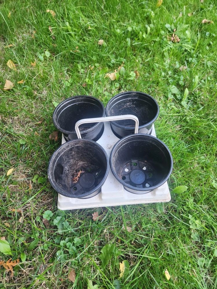 Selling a set of four black plastic plant pots, complete with a convenient carrier! They're about 4 inches in diameter, perfect for starting your seedlings or herbs Pick up only in the Yonge and Sheppard area. Cash only.