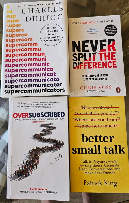 Selling a set of four books: - Charles Duhigg - Supercommunicator: How to Unlock the Secret Language of Connection - Chris Voss with Tahl Raz - Never Split the Difference: Negotiating As If Your Life Depended On It - Daniel Priestley - Oversubscribed: How to Get People Lining Up to Do Business with You (Second Edition) - Patrick King - Better Small Talk: Talk to Anyone, Avoid Awkwardness, Generate Deep Conversations, and Make Real Friends