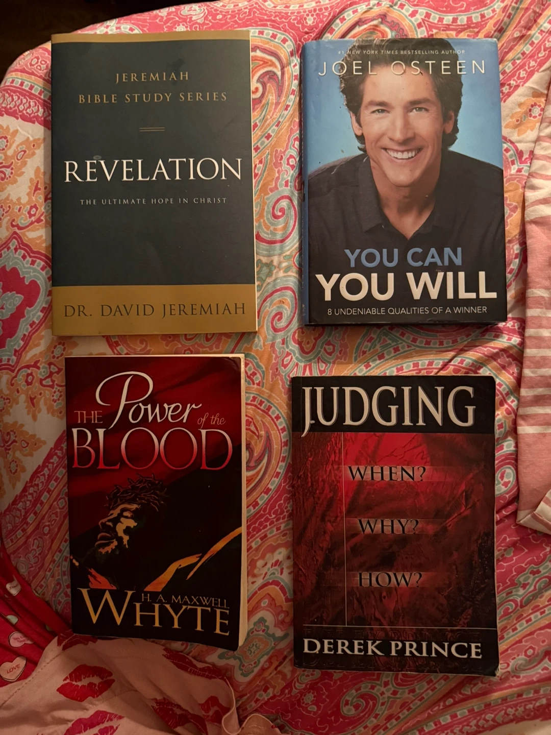 4 books: - Revelation: Bible Study Series, Dr. David Jeremiah - You Can, You Will, Joel Osteen - The Power of the Blood, H.A. Maxwell Whyte - Judging, Derek Prince
