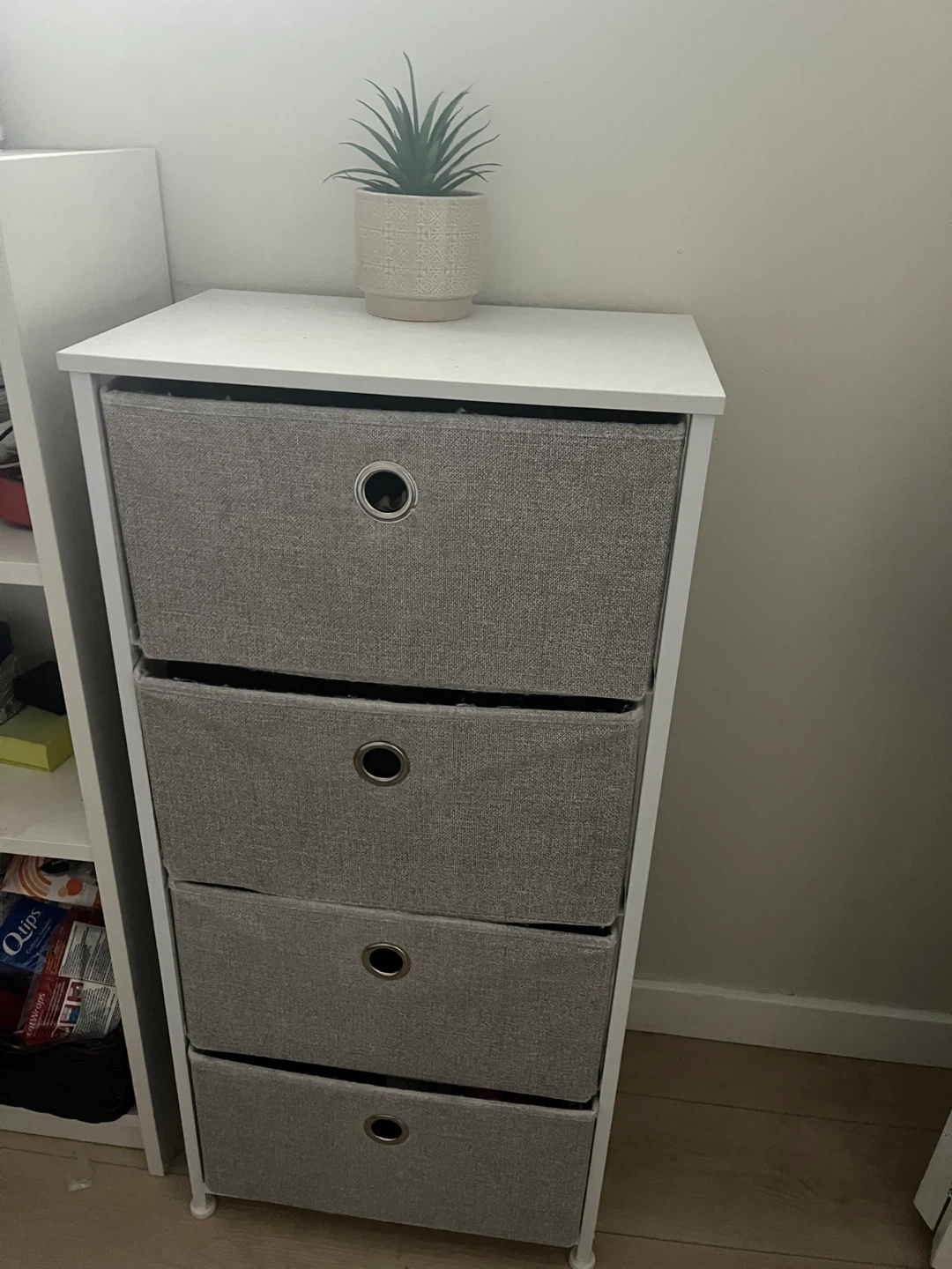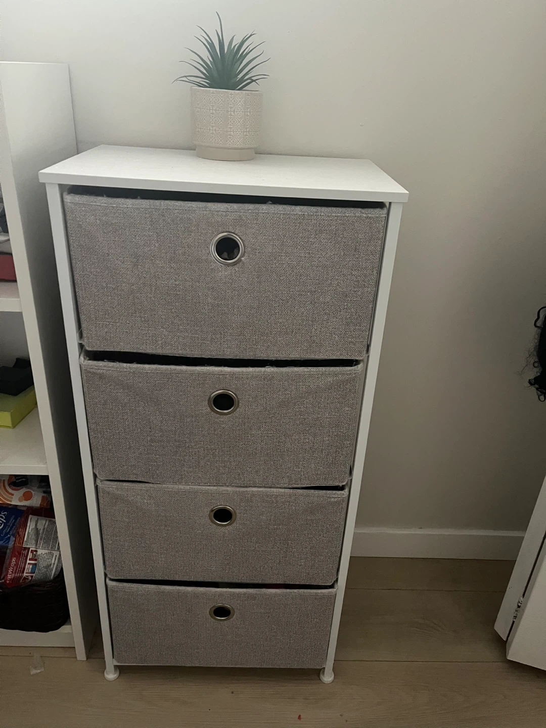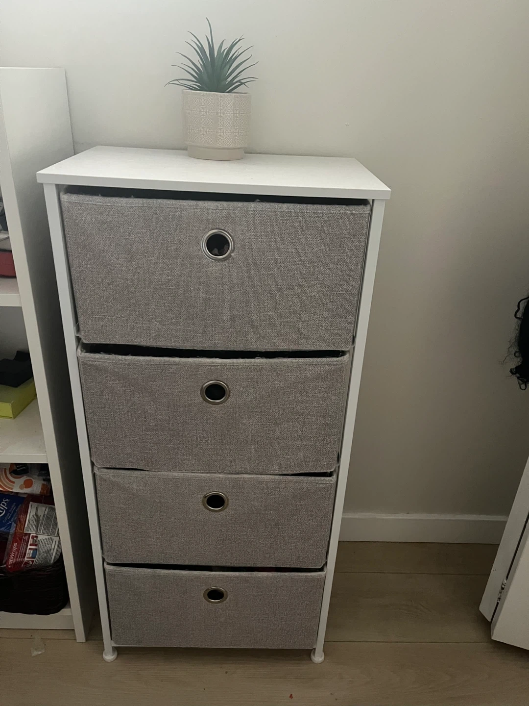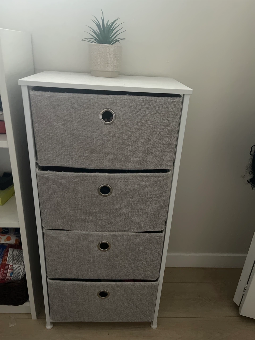 Looking to declutter? This 4-drawer storage tower is perfect for small spaces! It features a clean white frame and four grey fabric bins, making it a stylish and functional addition to any room. Great for organizing clothes, accessories, or household items