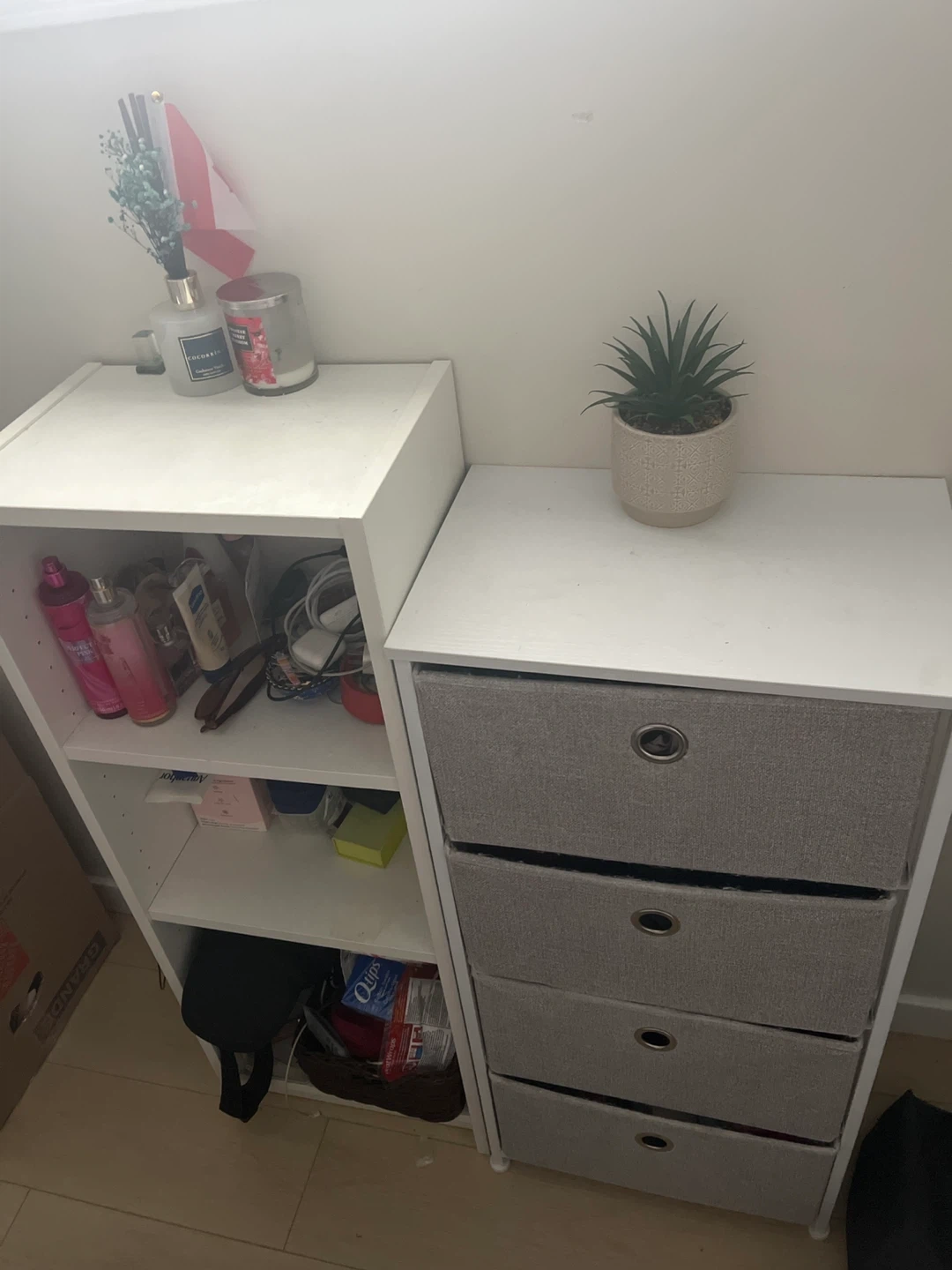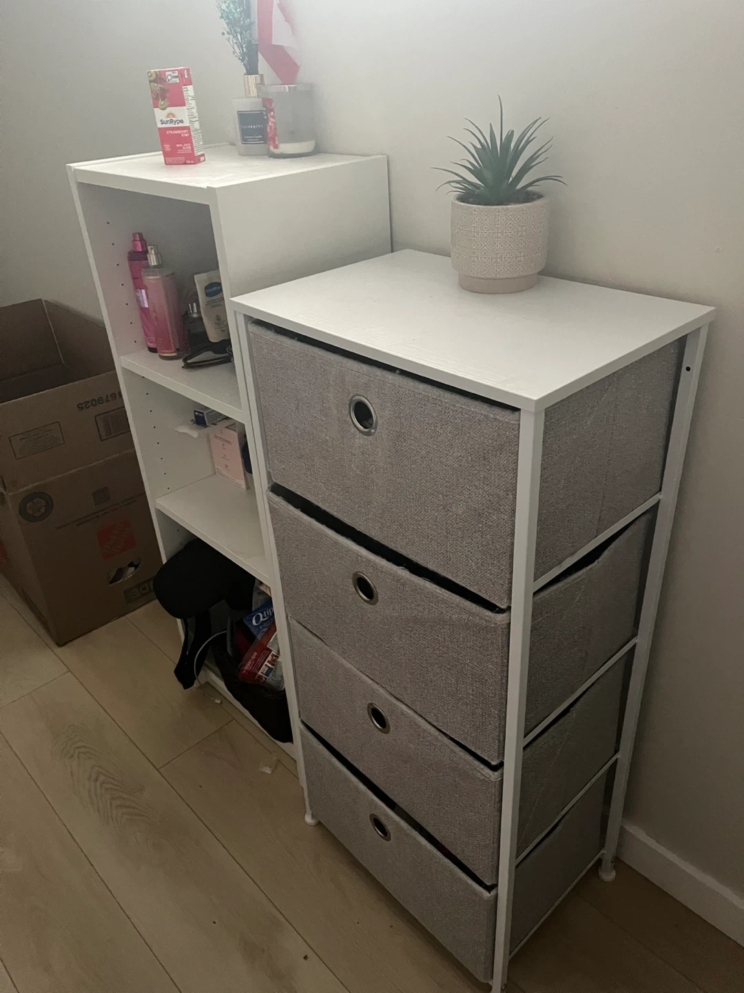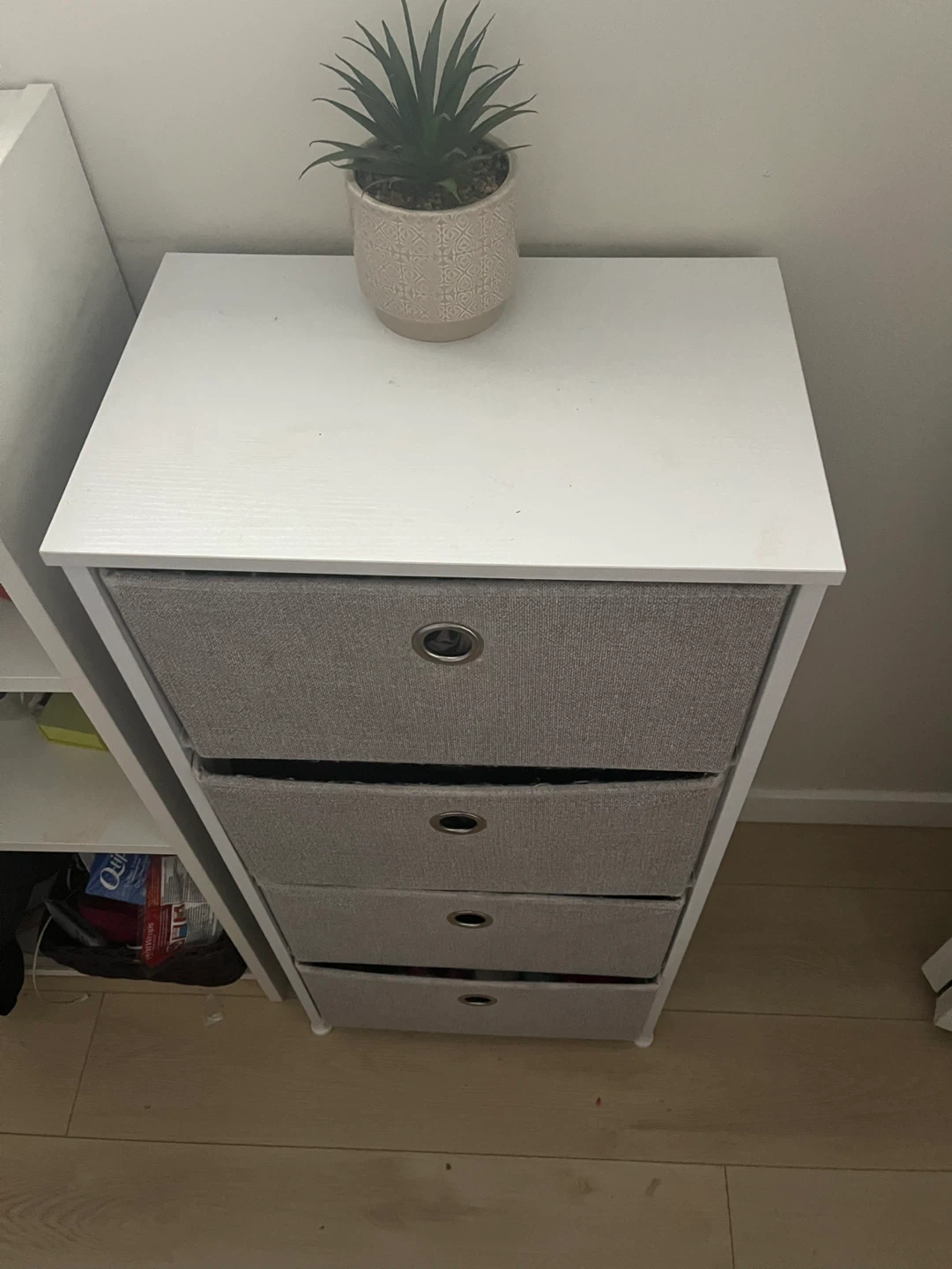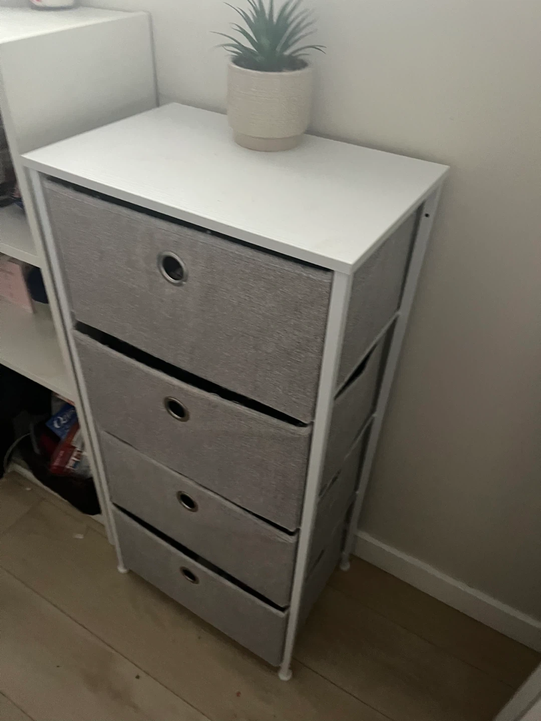 Looking to declutter? This 4-drawer storage tower is perfect for small spaces! It features a clean white frame and four grey fabric bins, making it a stylish and functional addition to any room. Great for organizing clothes, accessories, or household items