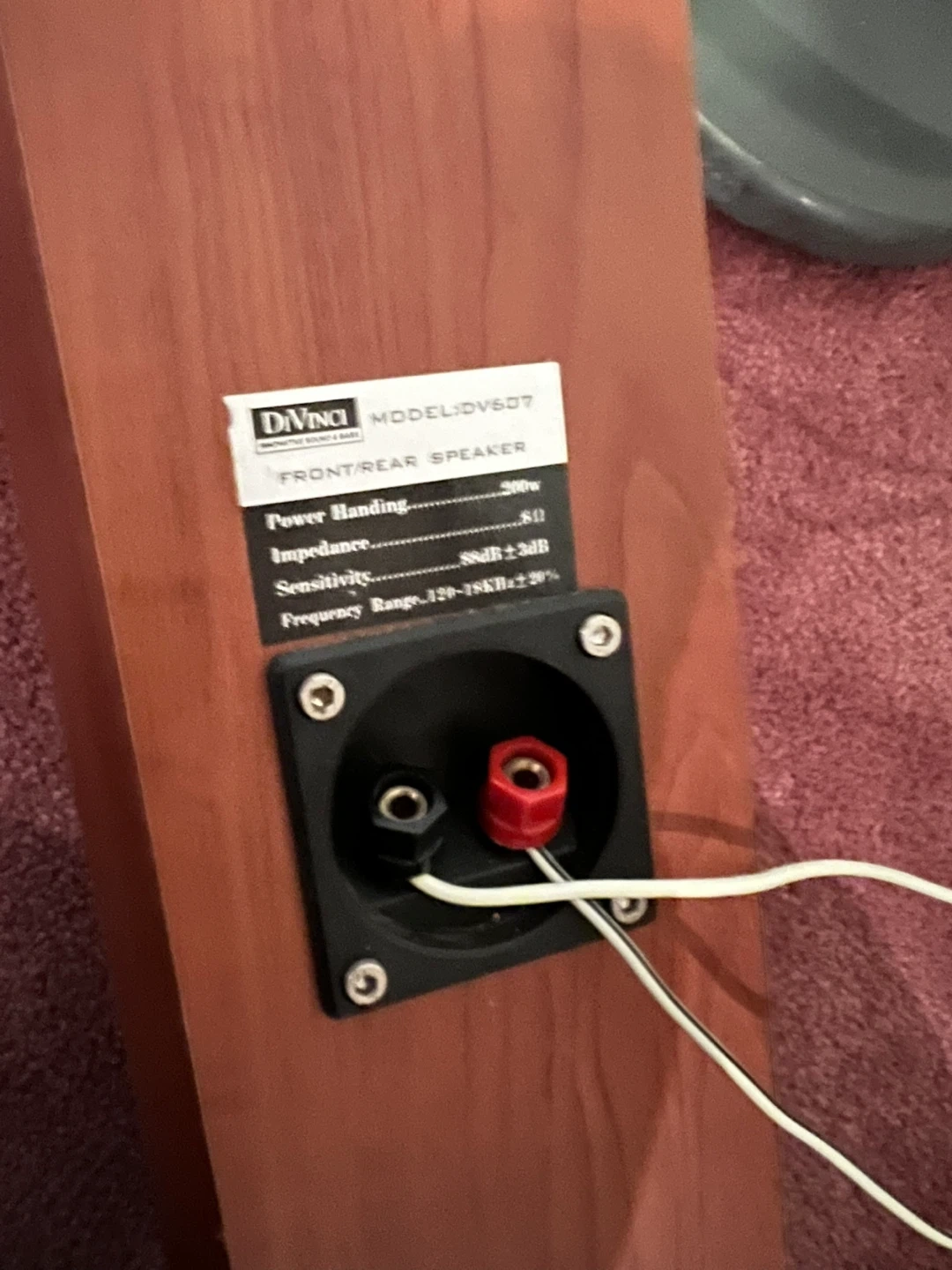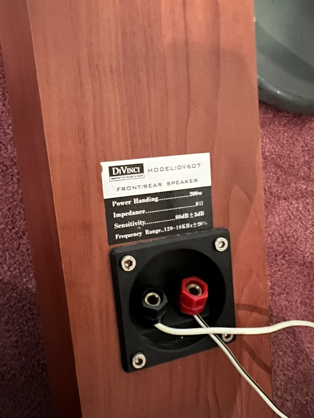 Selling a DiVinci DV607 front/rear speaker. It has a power handling of 200W, impedance of 8Ω, and sensitivity of 88dB ± 3dB. The frequency range is 120-18KHz ± 20%.
