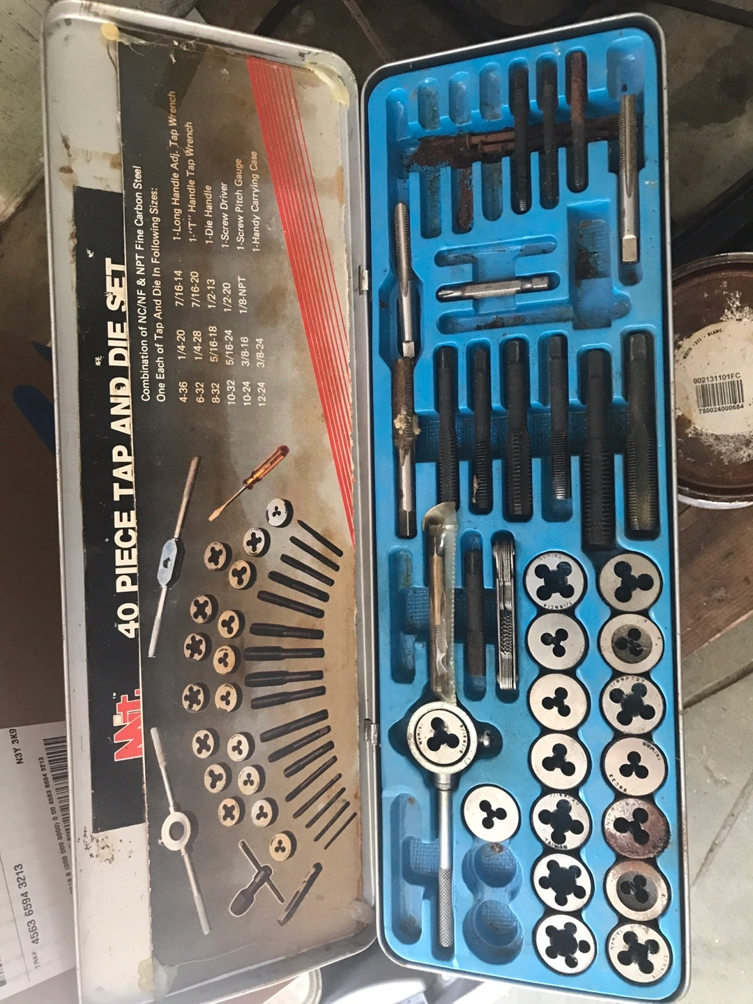 Selling a 40 piece tap and die set. It includes a combination of NC/NF & NPT fine carbon steel taps and dies in various sizes. It also comes with a long handle adjustable tap wrench, a "T" handle tap wrench, a die handle, a screwdriver, a screw pitch gauge, and a handy carrying case